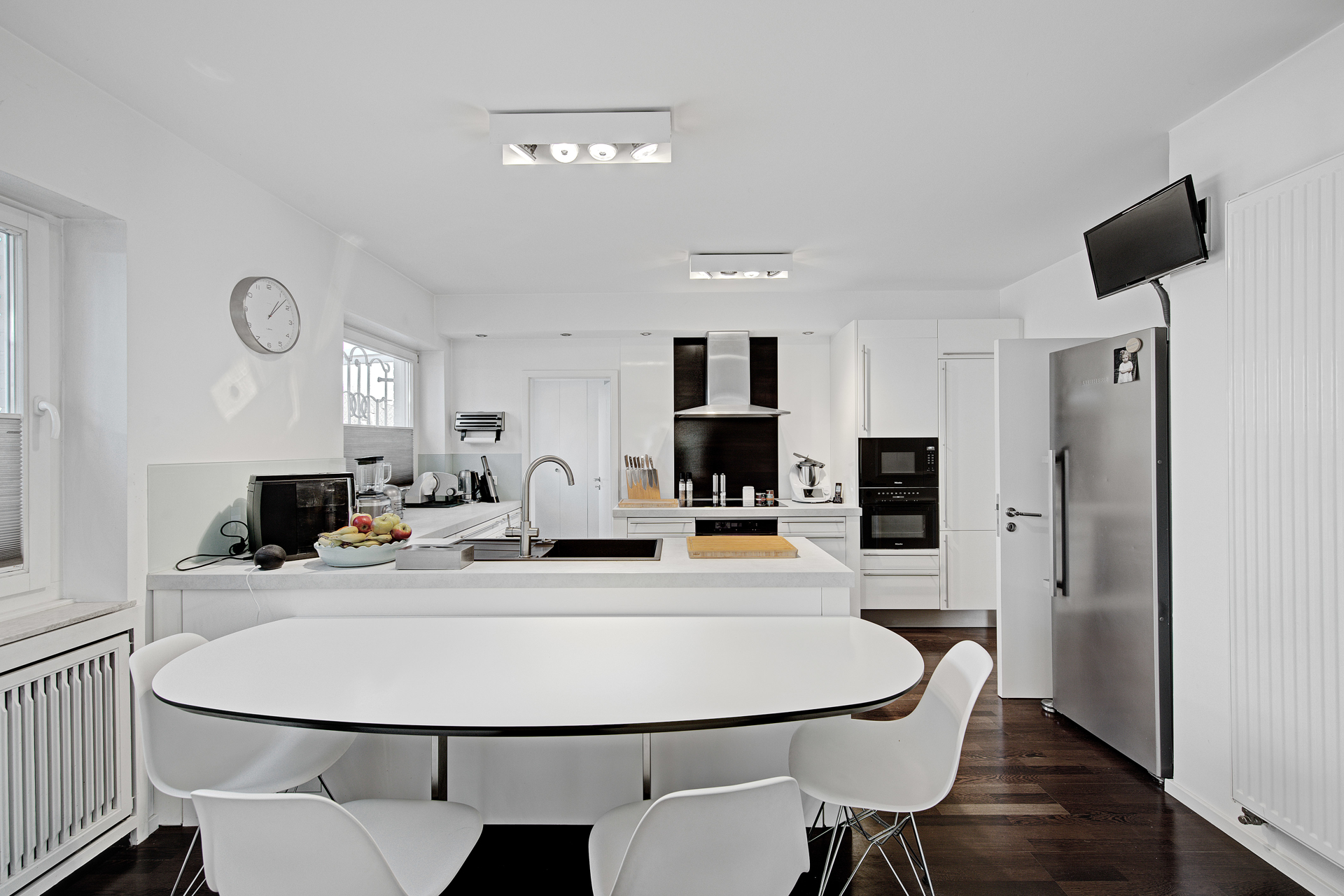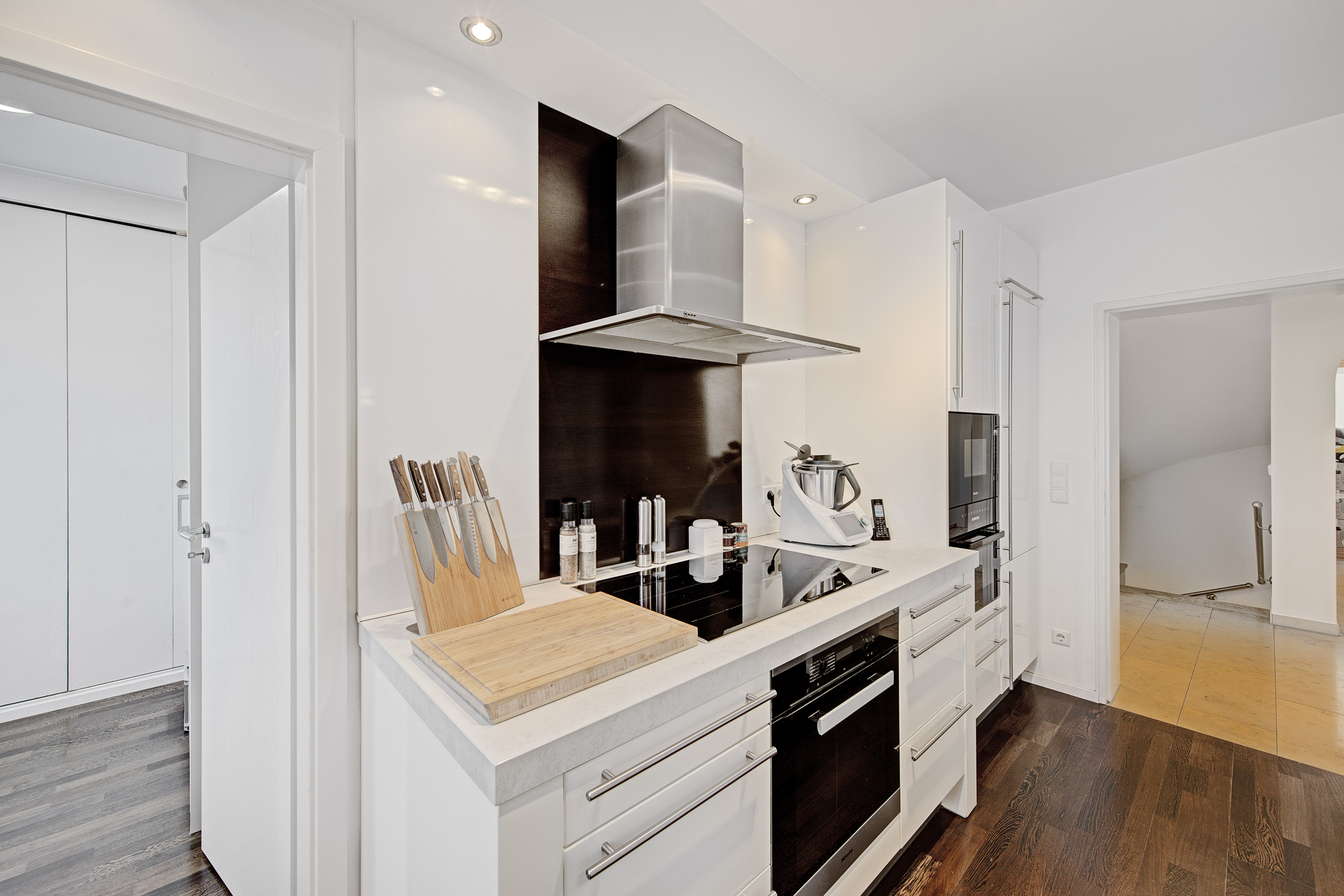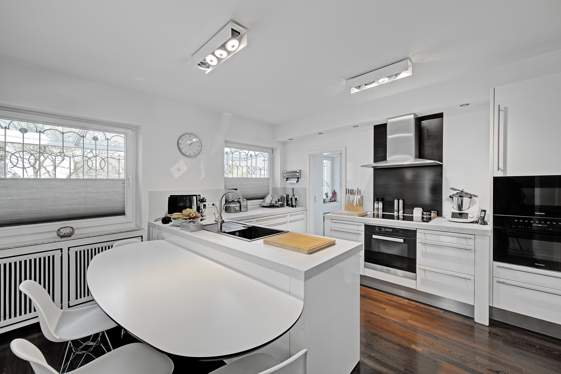 - An den Wohnbereich schließt sich der Essbereich an – großzügig, repräsentativ und zugleich ein Ort der Geselligkeit. Der direkte Zugang zur Küche, abtrennbar durch eine Holz-Schiebtüre, sorgt für kurze Wege und optimale Funktionalität. Die Küche selbst ist ein klares Statement an moderne Ästhetik und gehobene Ausstattung: Hochglanzweiße Fronten, edle Arbeitsplatten und modernste Einbaugeräte (u.a. Miele) schaffen eine Umgebung, in der Kochen zur Freude wird. Eine zentrale Insel mit integriertem Frühstückstresen schafft zusätzlichen Raum für Kommunikation und Genuss. Die dunkle Echtholz-Dielung steht in stilvollem Kontrast zum Weiß der Küchenmöbel.