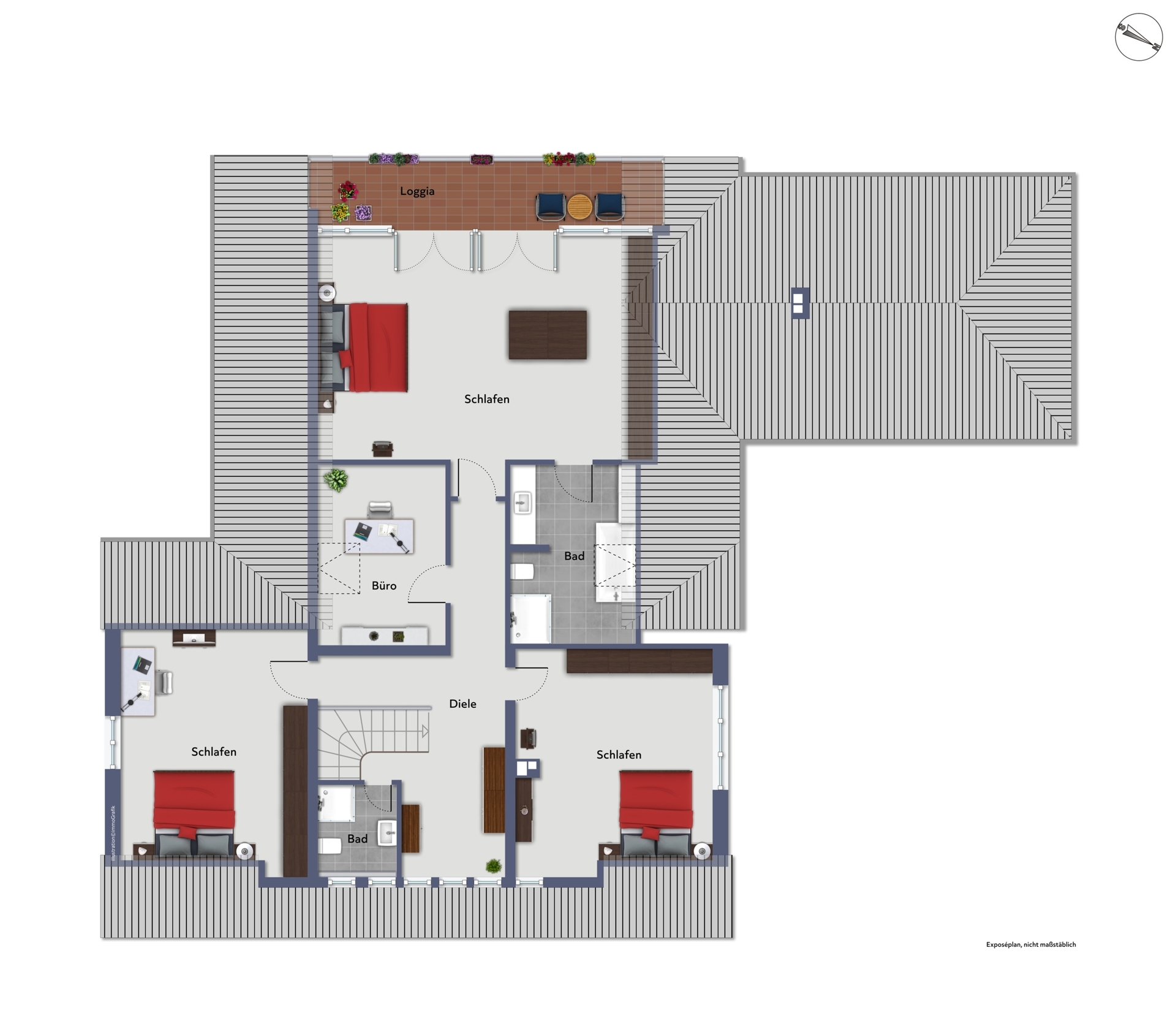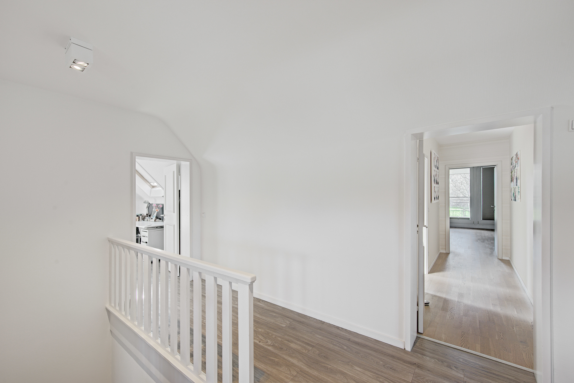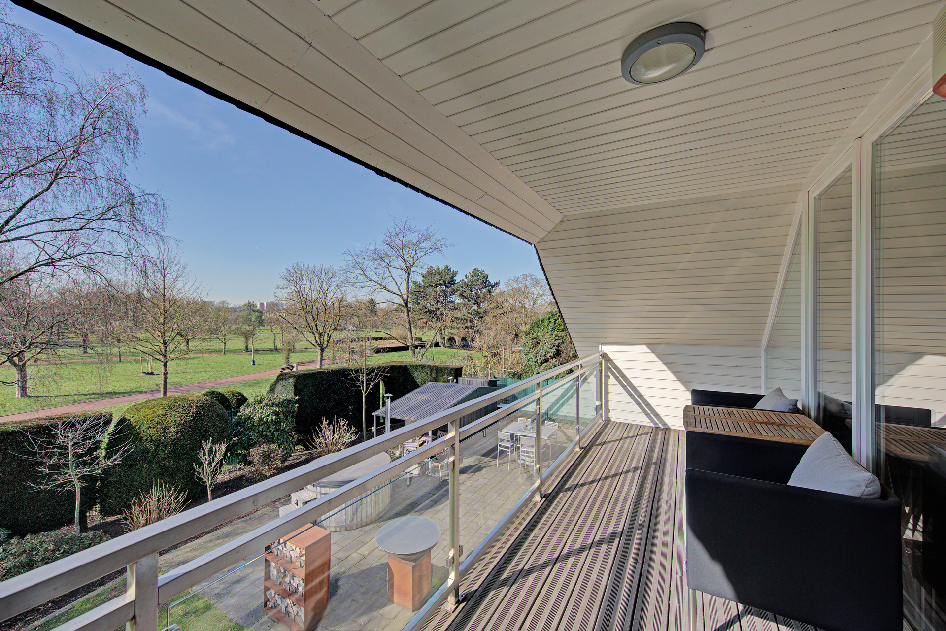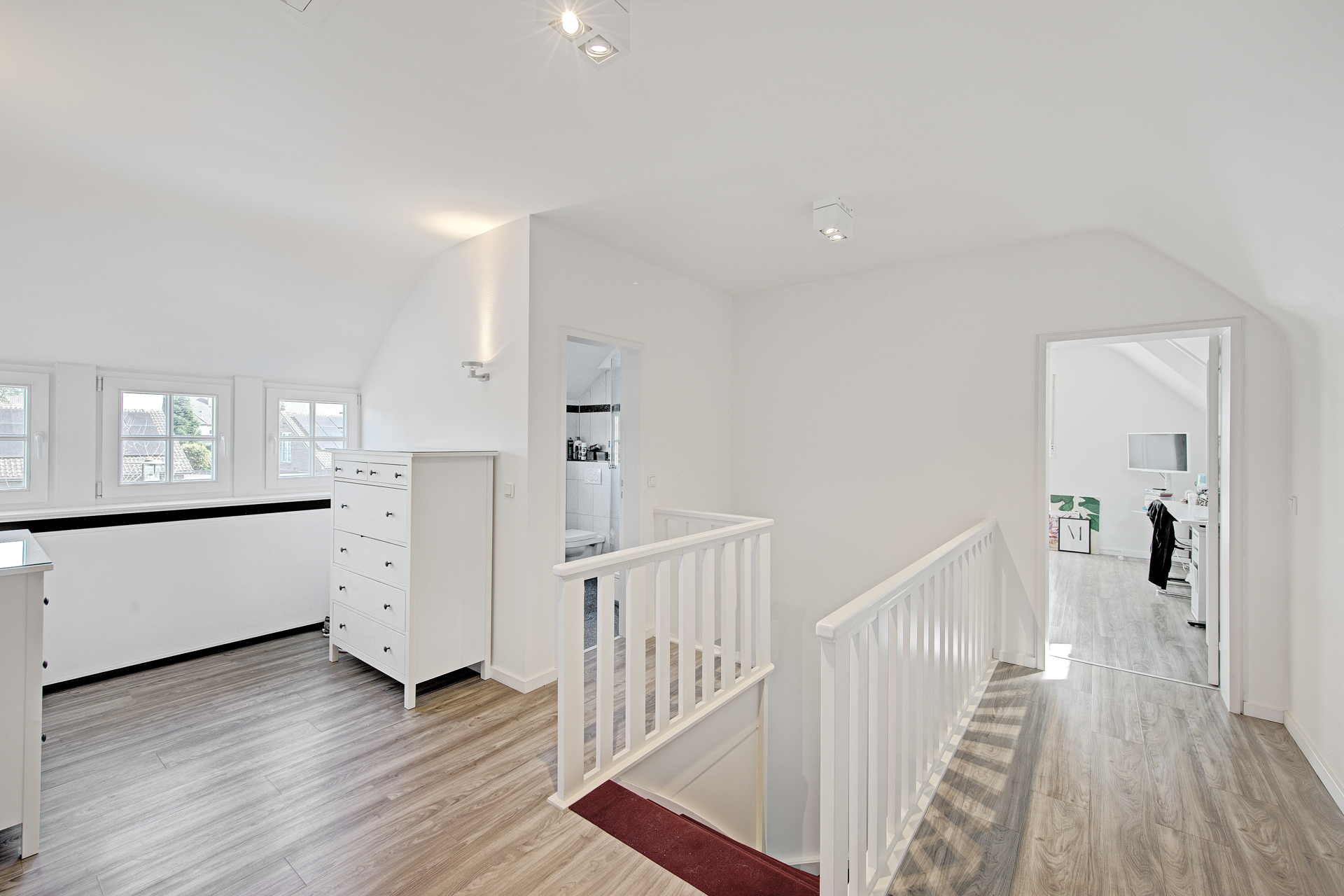 - Über die elegant belegte Treppe erreicht man das Obergeschoss, das durch die 2007 neu geschaffene Dachstruktur eine vollkommen neue Raumwirkung erhält. Das großzügige Elternschlafzimmer mit raumhoher Glasfront öffnet sich zu einem überdachten Balkon mit unvergleichlichem Blick in den Uerdinger Stadtpark. Hier vereinen sich Ruhe, Weite und Leichtigkeit zu einem unverwechselbaren Rückzugsort.