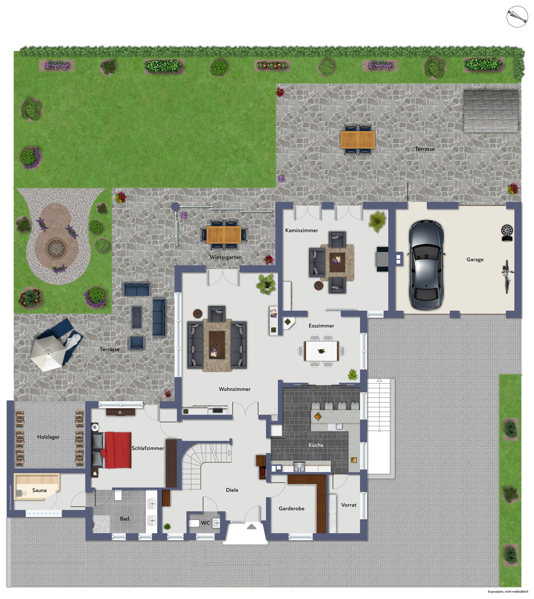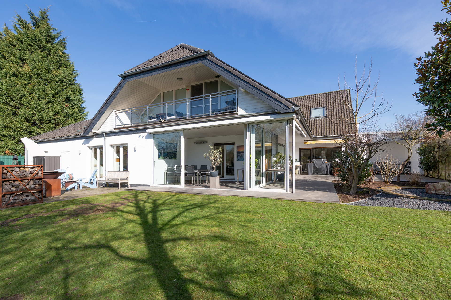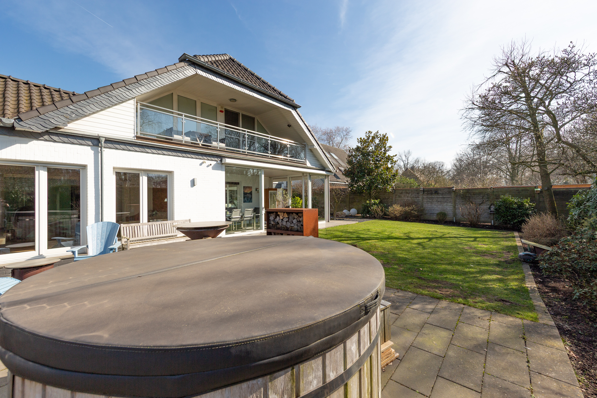 Der Garten – sonnenverwöhnt durch seine Süd-Südwest-Ausrichtung – ist ein wahrer Rückzugsort. Mehrere Terrassenbereiche, darunter eine stilvolle, verglaste Veranda, ermöglichen entspannte Stunden im Grünen zu jeder Jahreszeit. Der Rasen ist üppig und gepflegt, die Beete liebevoll angelegt, die Grundstücksgrenzen werden durch hochgewachsene Hecken stilvoll eingefasst. Ein besonderes Highlight ist der holzbeheizte Whirlpool, der neben einer Feuerstelle und gemütlichen Sitzecken ein echtes Outdoor-Wohnzimmer bildet. Diese können optional mitübernommen werden.