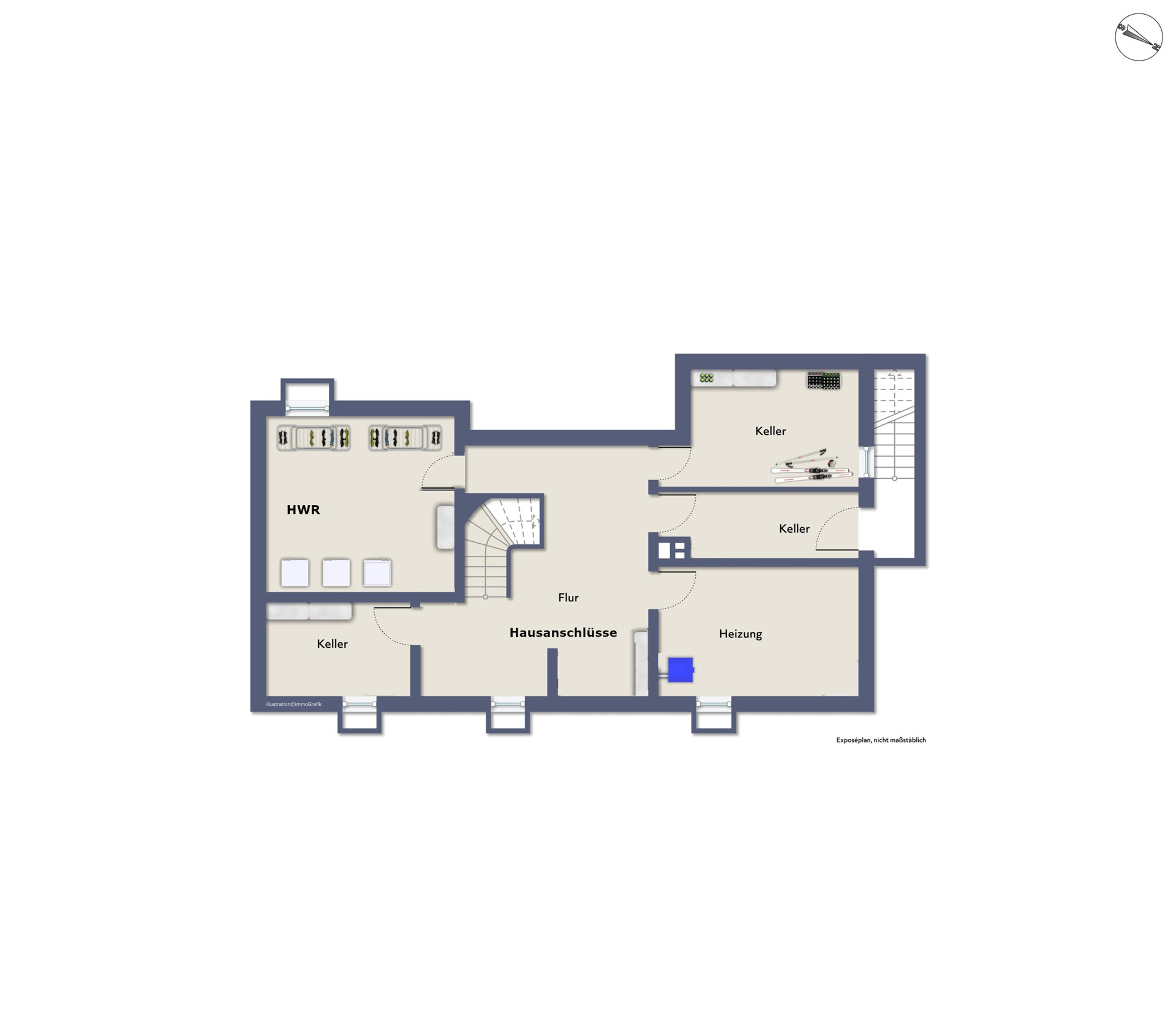 - Im Kellergeschoss stehen sämtliche funktionalen Räume zur Verfügung: Technik-, Hauswirtschaftsund Lagerräume sowie vielseitig nutzbare Flächen – etwa für Fitness, Hobby oder als Stauraum.