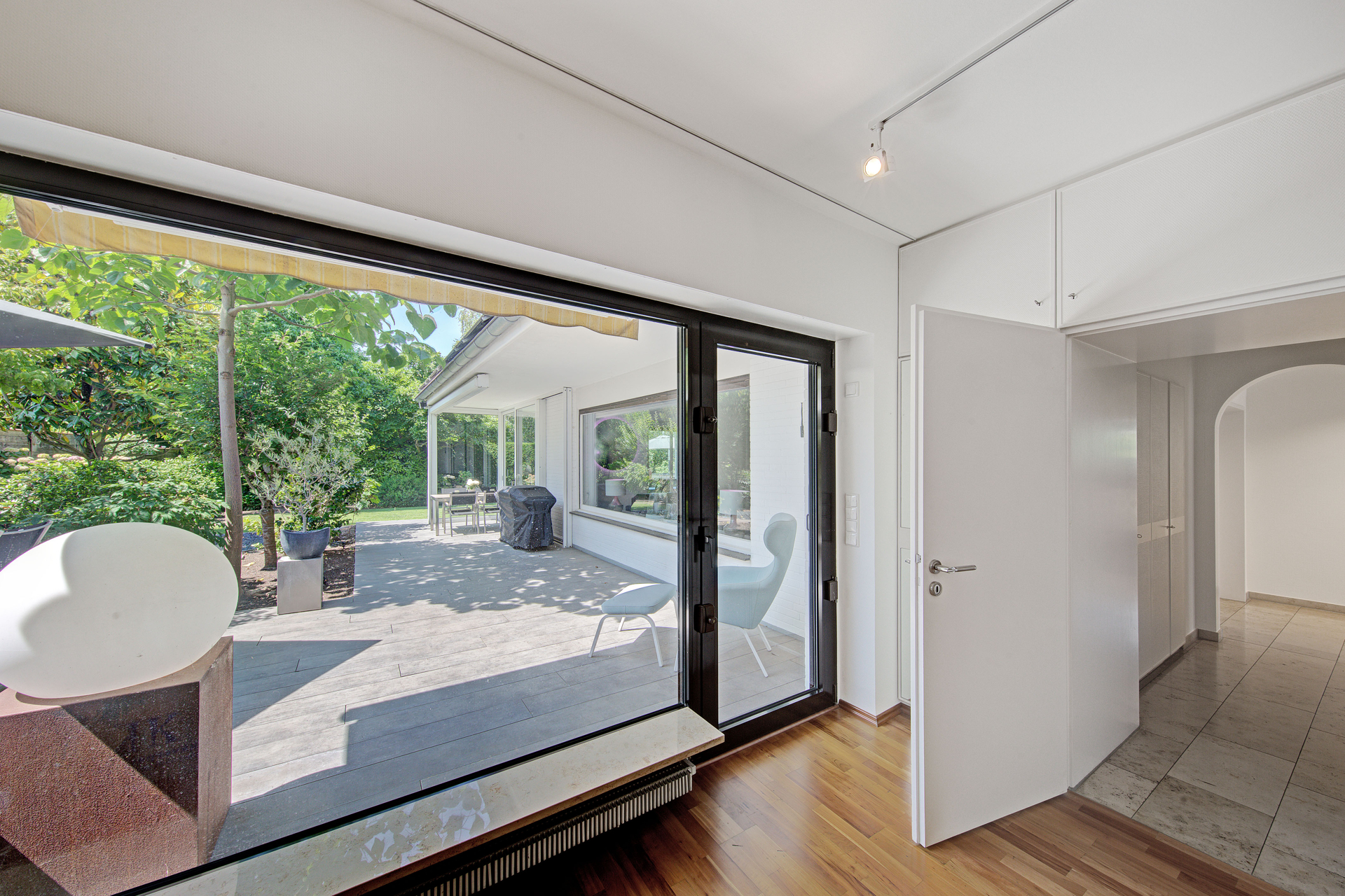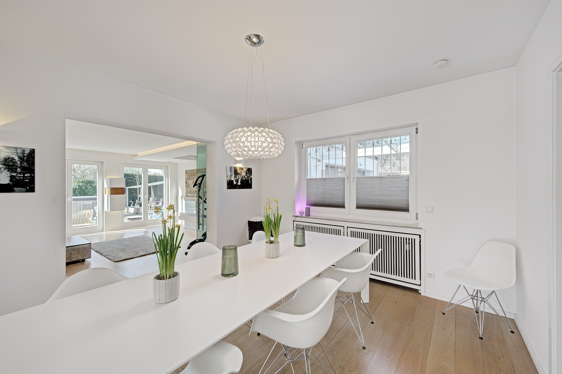- Geradeaus öffnet sich das Herzstück des Hauses: ein weitläufiger, lichtdurchfluteter Wohnund Essbereich, der durch fließende Übergänge und große Fensterflächen besticht. Die zum Garten hin ausgerichteten, raumhohen Verglasungen holen das Grün des Außenbereichs nahezu in den Raum hinein. Hier verschmelzen Innenund Außenwelt auf besonders gelungene Weise. Ein hochwertiger Echtholzparkettboden in Eiche Landhausdiele lackiert unterstreicht die behagliche Atmosphäre.