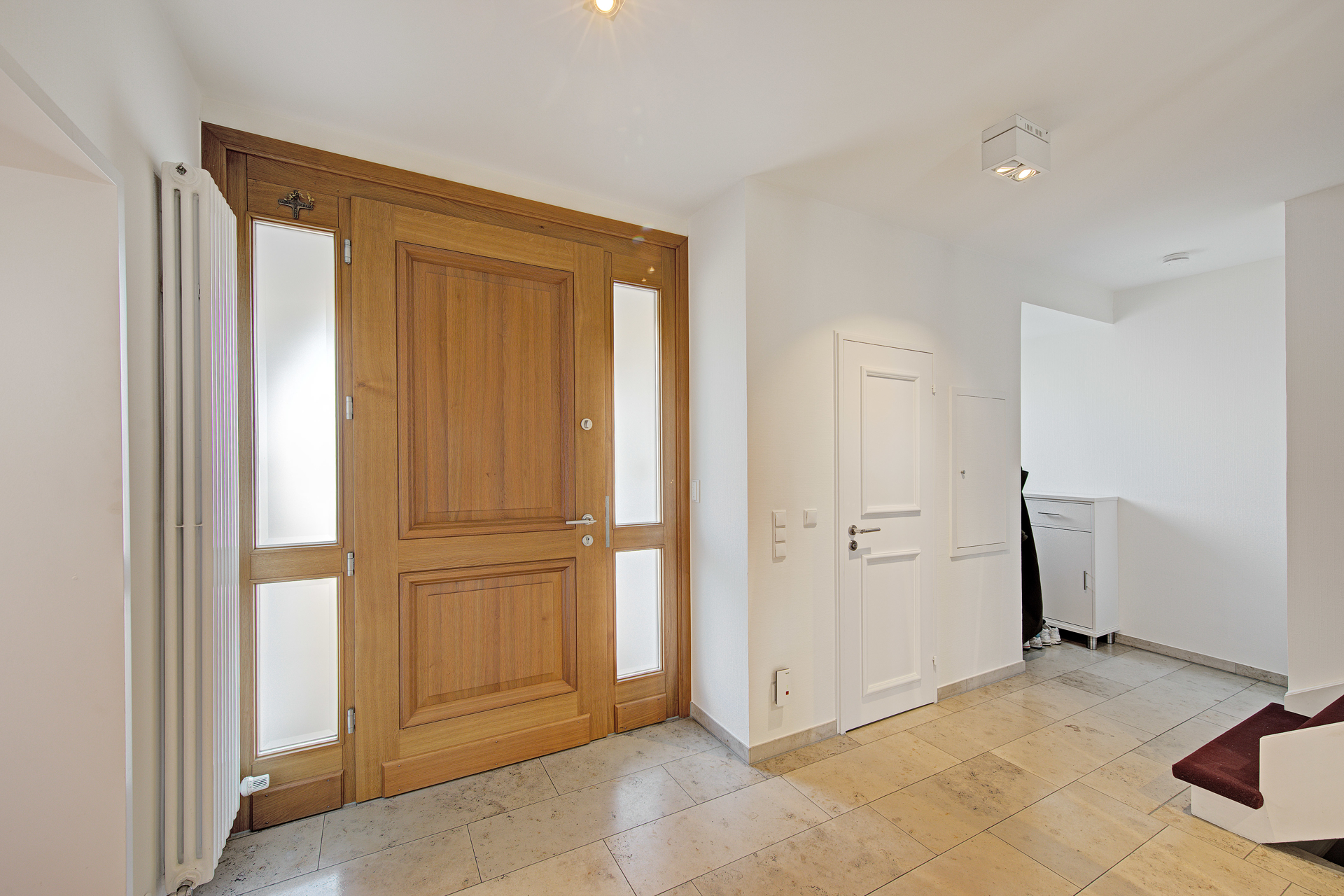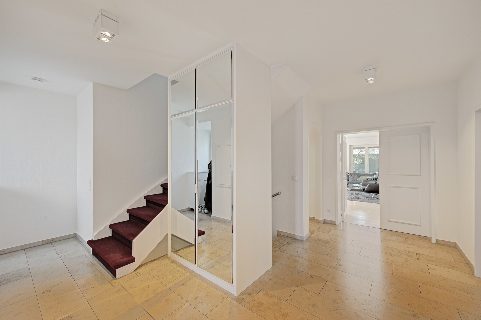 - Bereits beim Betreten der Immobilie eröffnet sich ein Eindruck von Klarheit, Eleganz und architektonischer Großzügigkeit. Der einladende, offen gehaltene Eingangsbereich überzeugt mit hellen, großformatigen Travertin-Natursteinfliesen, glatten weißen Wänden und hochwertigen Einbauschränken mit Spiegelfronten – ein dezenter Luxus, der Funktionalität und Ästhetik vereint. Die geschwungene Holztreppe, mit weichem Teppich belegt, setzt einen warmen Kontrapunkt zur sachlich-eleganten Gestaltung des Flures.