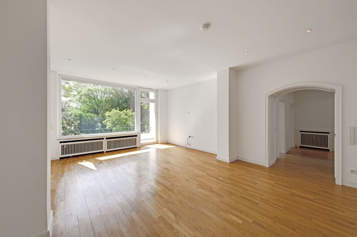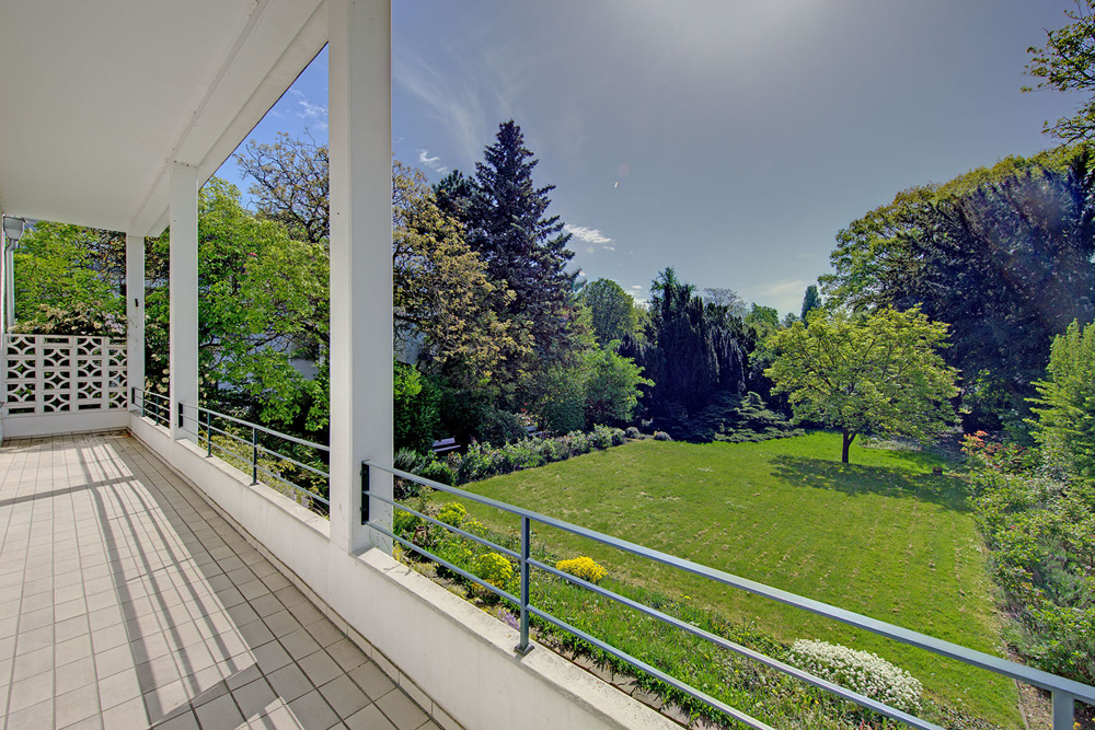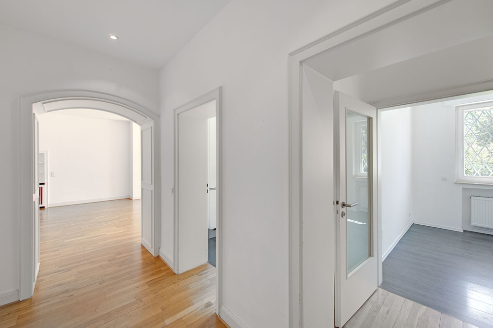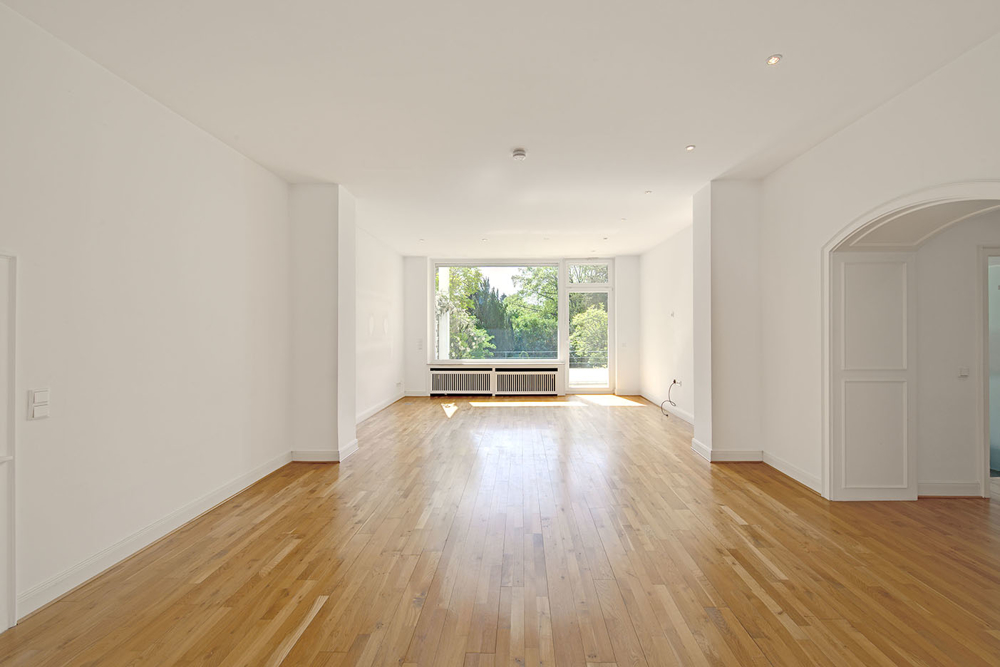Die modernisierte Hochparterre-Wohnung befindet sich im rückwärtigen, zum Garten ausgerichteten Teil der historischen Mehrfamilienvilla. Absolut ruhig gelegen und ideal nach Süden ausgerichtet, genießen Sie den traumhaften Ausblick in die parkähnlichen Gärten und den alten Baumbestand.