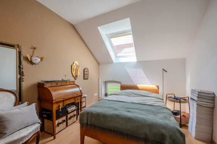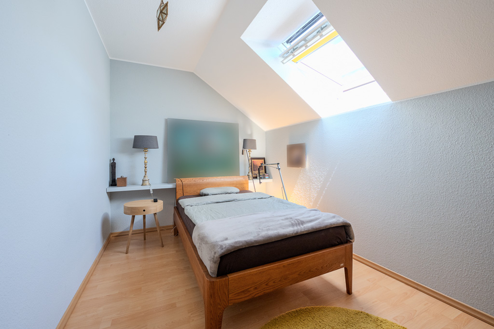 Von der Diele aus führt eine Stahltreppe mit Holzstufen in die obere Etage. Hier befinden sich drei Zimmer sowie ein hell gefliestes großzügiges Bad mit Badewanne und Dusche. Bei Bedarf kann man die Wand zwischen Büro und Kinderzimmer auch entfernen und so ein zweites großes Schlafzimmer schaffen. Auch im Obergeschoss liegt in allen Räumen Fußbodenheizung.
