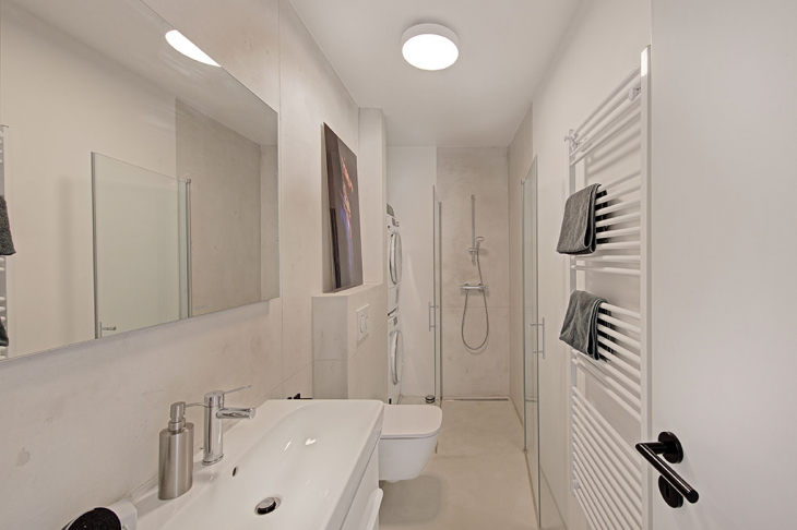 • Bäder mit Komfort: Beide Bäder verfügen über bodengleiche Duschen in Beton-Design. Das Tageslichtbad bietet ebenso eine Badewanne. Das innenliegende und ebenso geräumige Badezimmer ist zudem mit einer praktischen Wasch- und Trockenstation ausgestattet.
