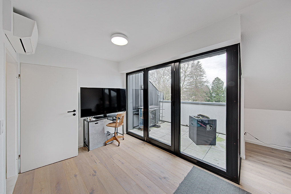 • Perfekte Raumaufteilung: Neben den beiden Schlafzimmern – eines davon mit separatem Ankleidezimmer – gibt es ein kleines Fitness- oder Yogazimmer, ggf. auch für Kurzzeitgäste. Zusätzlich befindet sich ein Arbeitsbereich in einem charmanten Gaubenbereich mit halbrundem Fenster.