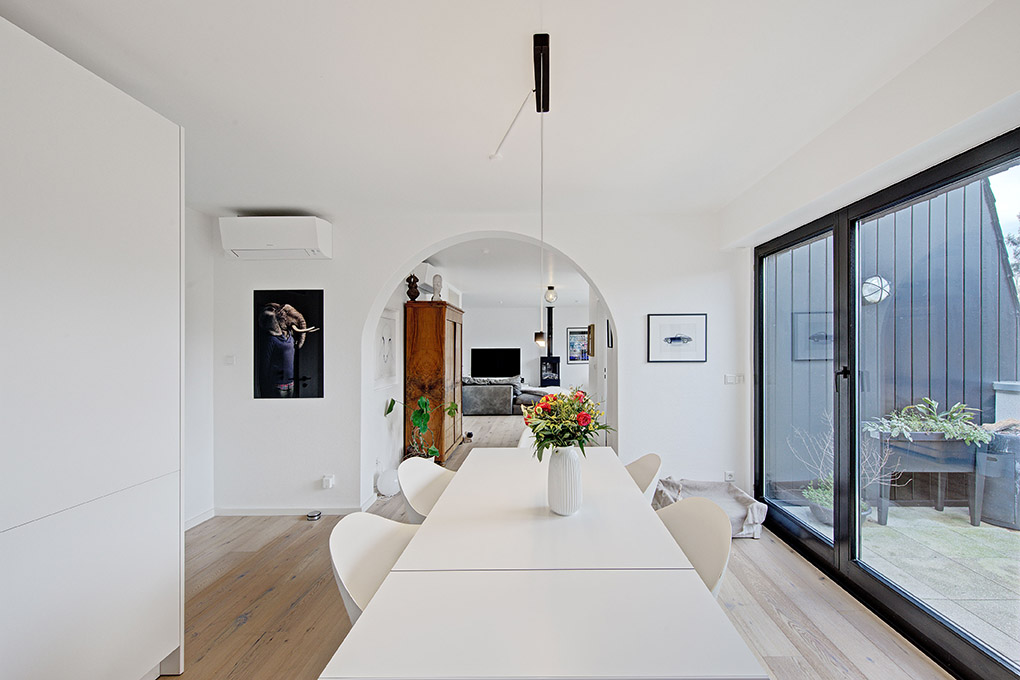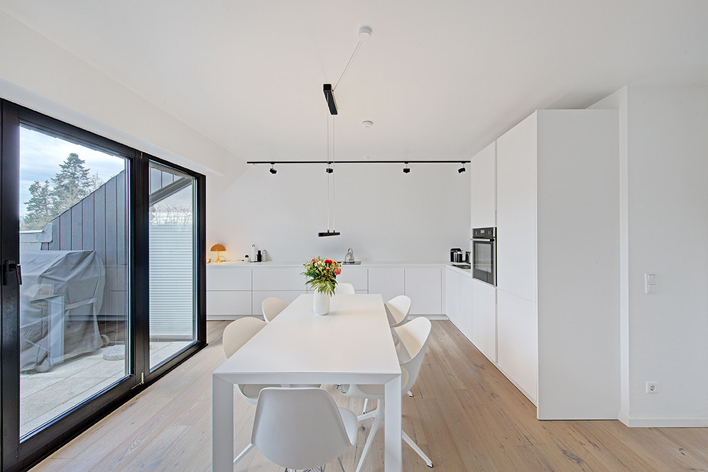 • Lifestyle: Allseits schneeweiße Wände und Decken harmonieren perfekt mit den elegant schwarzen Fensterrahmen in dunklen Ebenholztönen. Flur und Ankleide mit weißen Einbauschränken- und Regalen und ein separates, kleines "Oval-Office" zwischen Wohn- und Essbereich: Ein Eyecatcher im offenen ca. 63 m² Wohnbereich.
