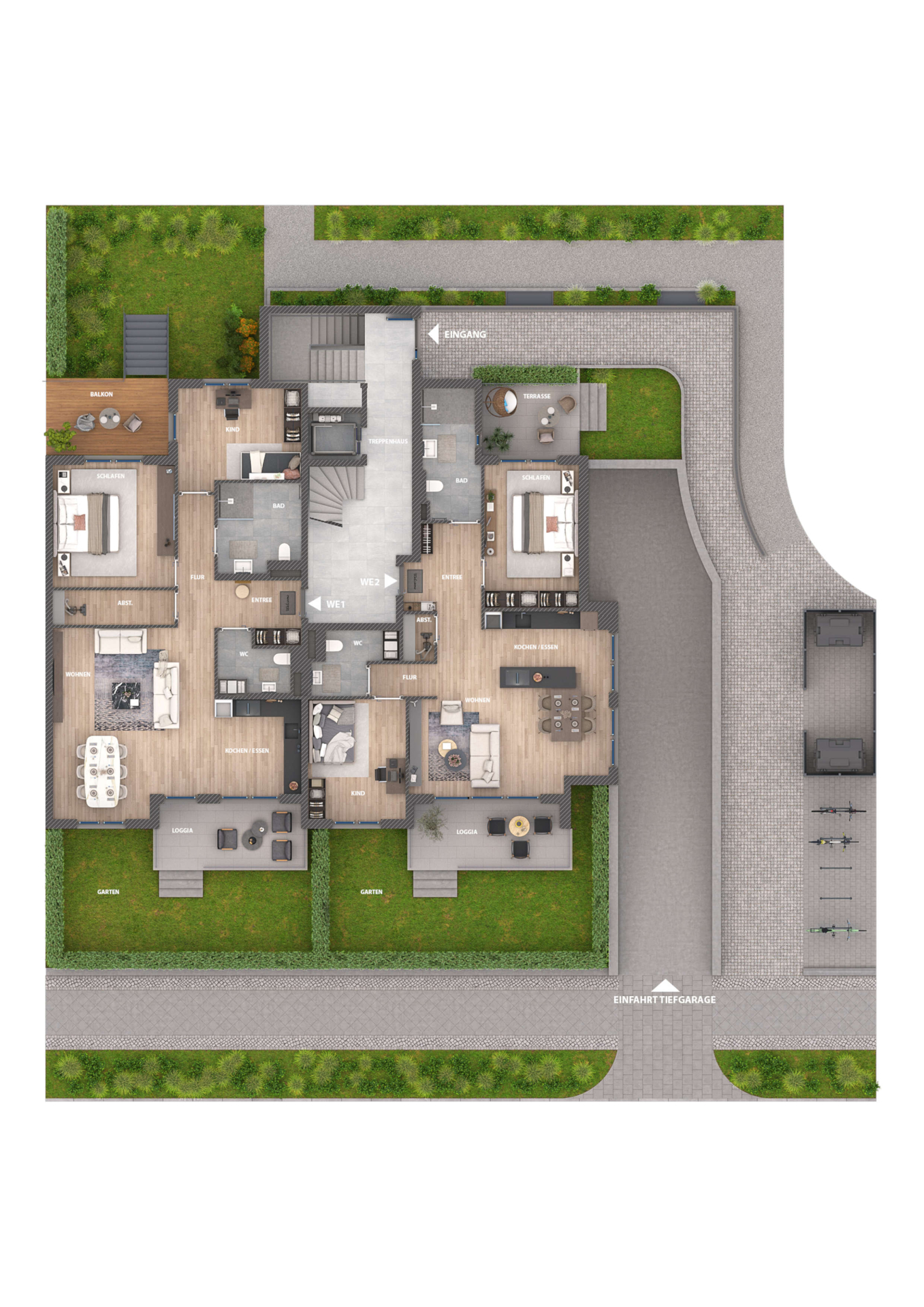 - · Erdgeschoss-Wohnungen mit Privatgärten (Sondernutzungsrecht)