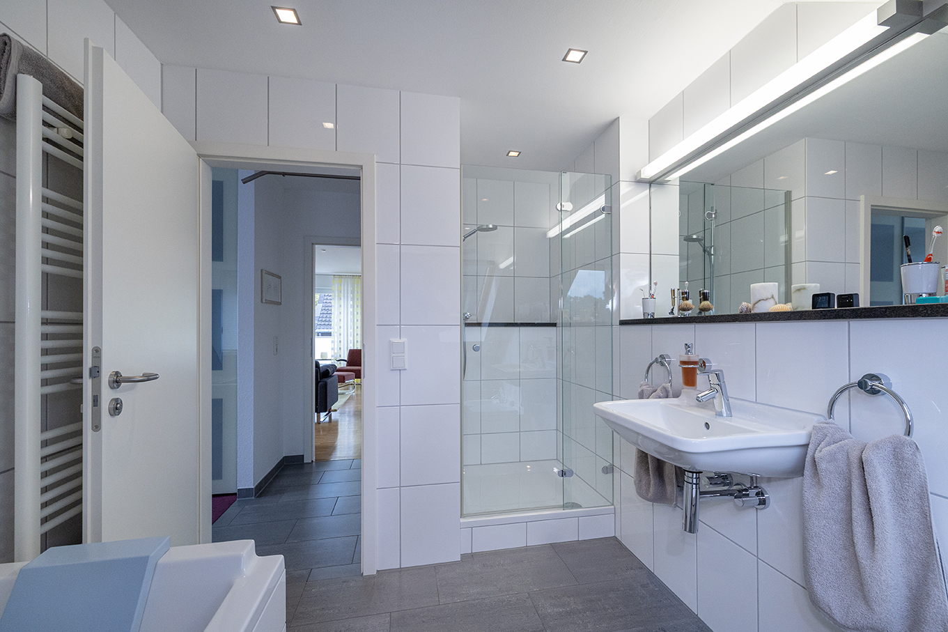 Das geräumige Tageslichtbad mit Badewanne, separater Dusche, Bidet und großem Spiegel lässt keine Wünsche offen.