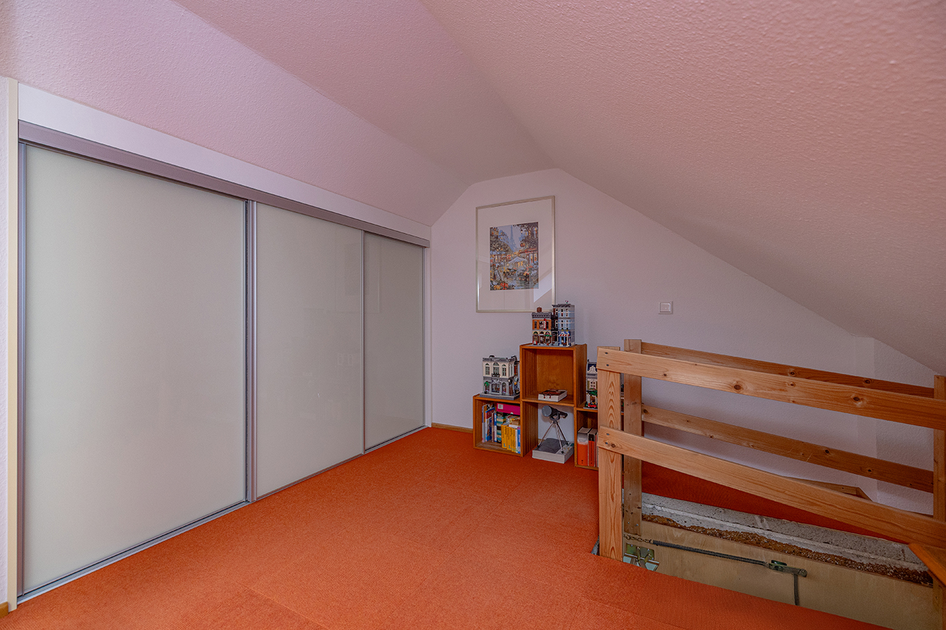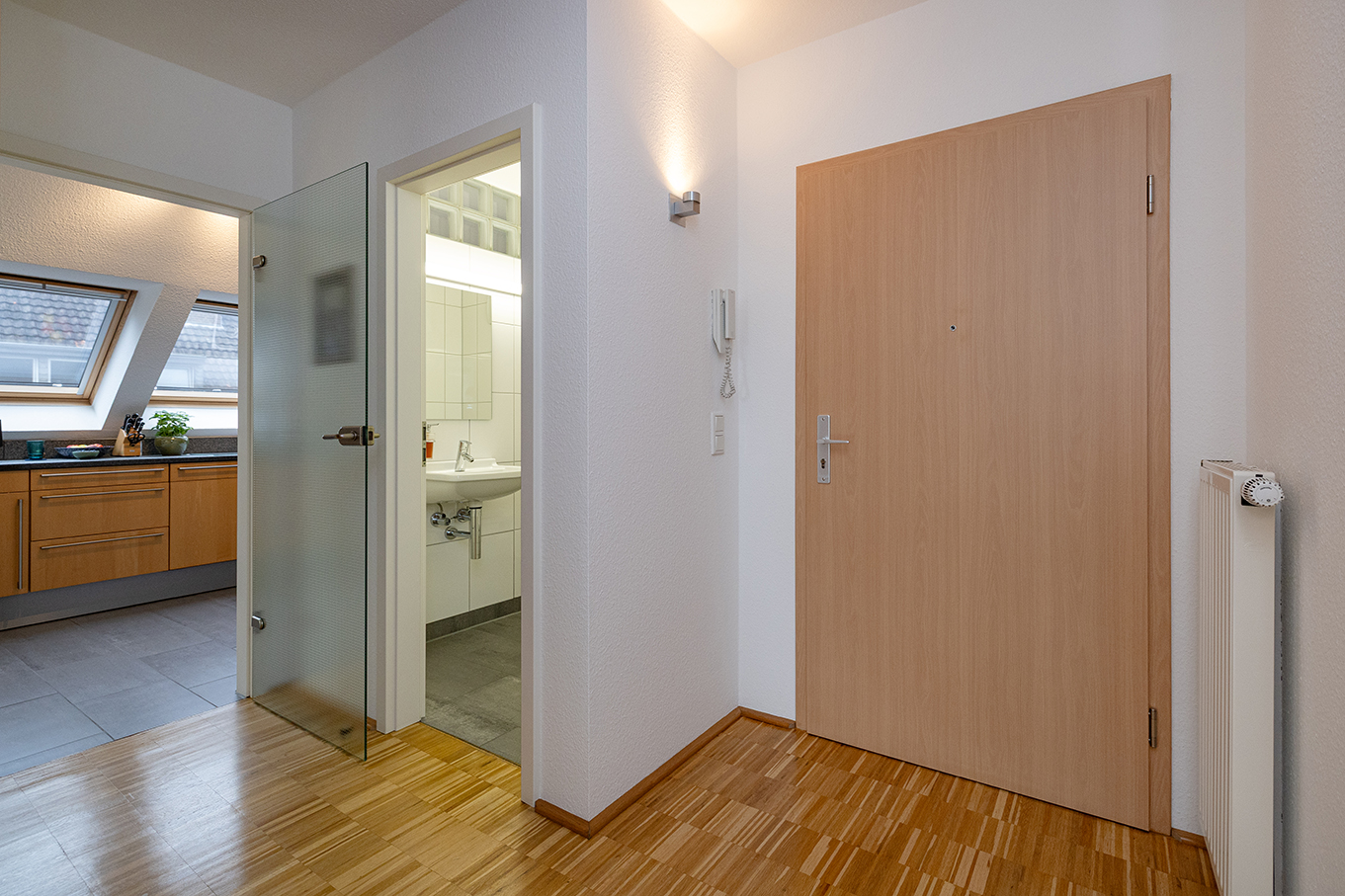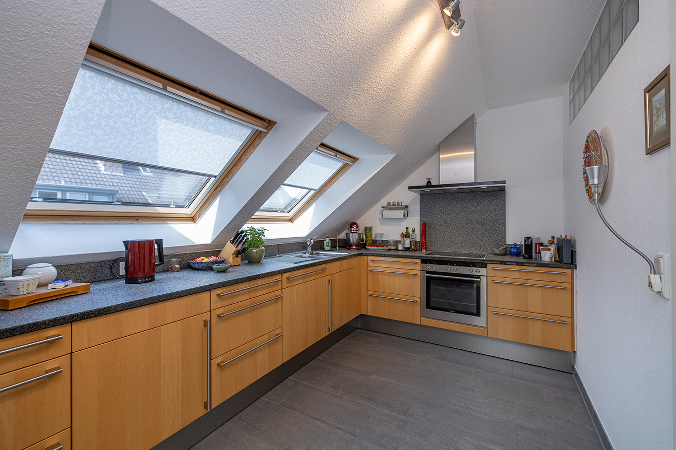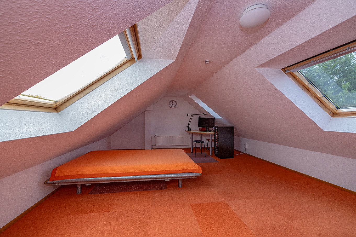 Als besonderes Highlight steht den Käufern zusätzlich zur Wohnfläche ein wohnlich ausgebauter Spitzboden - ideal für Besucher oder als zusätzlicher Stauraum zur Verfügung. Der Raum ist über eine Auszugstreppe von der Wohnung und dem dritten Zimmer aus erreichbar.