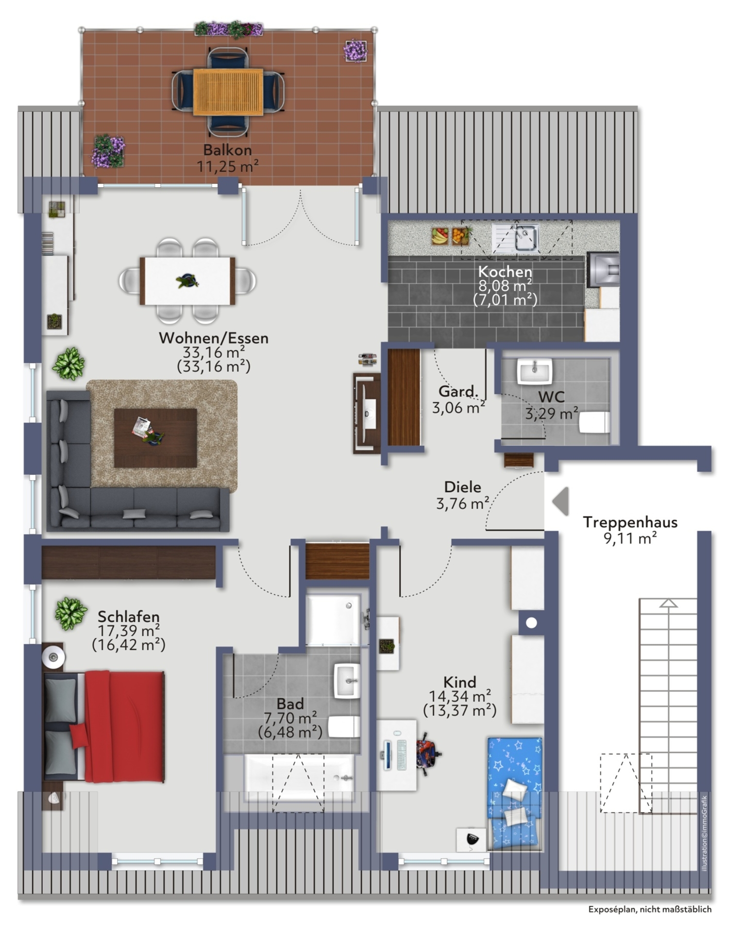 Auf ca. 89 m² Wohnfläche erwartet Sie ein durchdachter Grundriss mit einem hellen, weitläufigen Wohnzimmer, das durch große Fensterflächen in Süd- und Westausrichtung ganztägig mit Tageslicht versorgt wird. Von hier aus betreten Sie den großzügigen Balkon in Westlage, der besonders in den Nachmittags- und Abendstunden zum Entspannen einlädt.