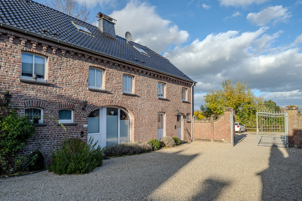 Der ehemalige Gutshof verfügt über zwei prägnante Zugänge: ein massives Holztor als traditionelle Hauptzufahrt sowie ein elegantes schmiedeeisernes Tor bei den Garagen. Die Wohnungseingänge liegen geschützt im Innenhof, der einen privaten, einladenden Bereich mit ländlich-historischem Flair vermittelt.