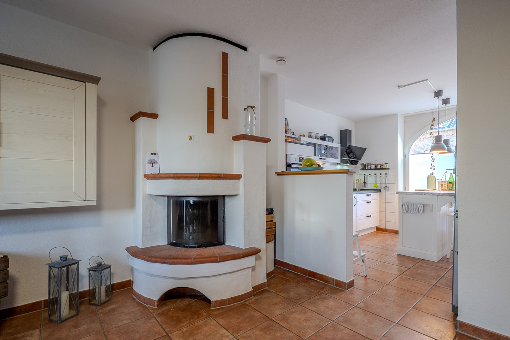Beim Betreten der Wohnung gelangt man zunächst in den Dielenbereich in dem sich auch der Zugang zum hell gefliesten Gäste-WC befindet. Bereits hier öffnet sich der Blick in das großzügige, offen gestaltete Wohn- und Esszimmer, das nahtlos in die offene Küche übergeht. Ein besonders stimmungsvolles Highlight ist der zentrale, gemauerte Kamin, der an kühleren Tagen zu gemütlichen Stunden vor dem knisternden Feuer einlädt.