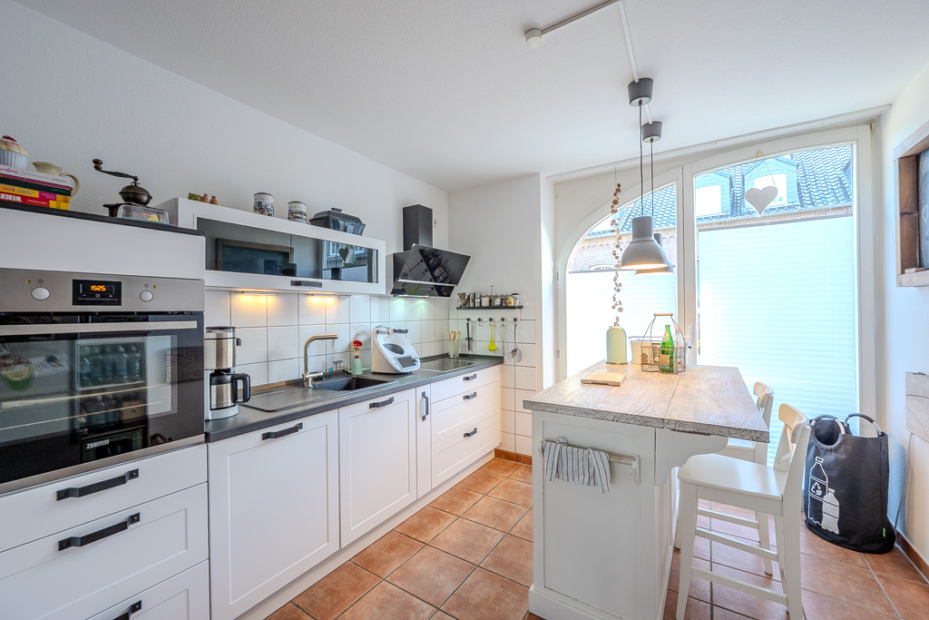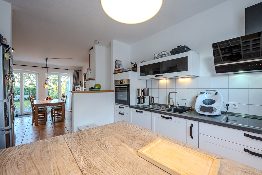Bodentiefe Rundbogenfenster fluten die Küche mit Licht und schaffen im Wohnbereich eine harmonische Verbindung zur gepflasterten Terrasse und zum idyllischen Garten. Das gesamte Erdgeschoss ist durchgehend mit mediterranen Fliesen ausgestattet, die dank der Fußbodenheizung jederzeit eine angenehme Wärme ausstrahlen.