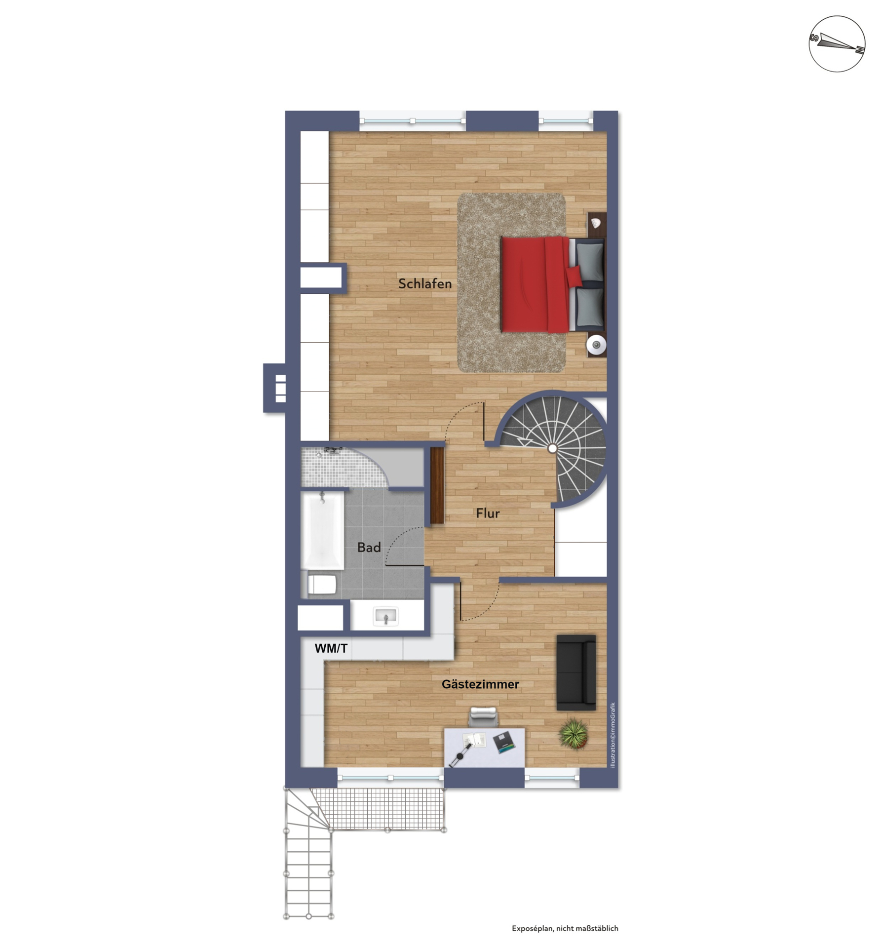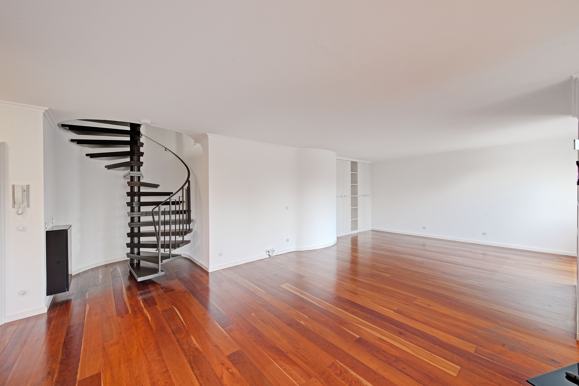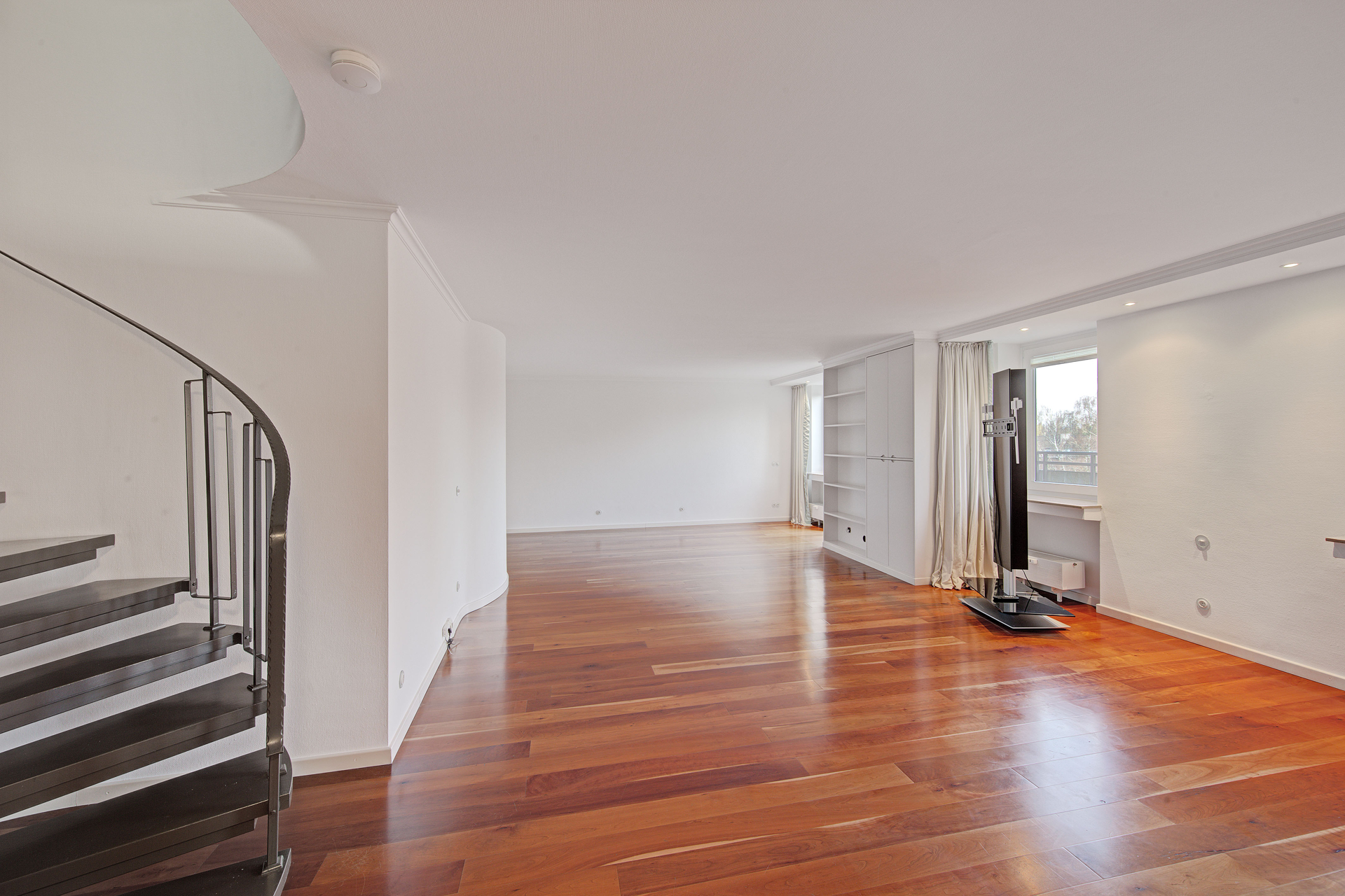 Bereits beim Betreten der Wohnung wird die besondere Raumwirkung spürbar. Der direkte Eintritt in den weitläufigen Wohnbereich vermittelt sofort Präsenz. Licht, klare Proportionen und eine offene Raumstruktur prägen den Eindruck. Die architektonisch markante Wendeltreppe aus Stahl mit Holzstufen verbindet beide Ebenen elegant miteinander und unterstreicht den eigenständigen Charakter dieser Maisonette, ohne sich in den Vordergrund zu drängen.