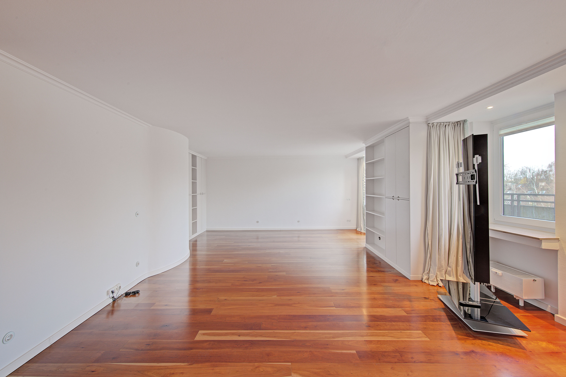 Die untere Wohnebene umfasst den großzügigen Wohnbereich, eine separate Einbauküche sowie ein hochwertig ausgestattetes Gäste-WC. Von der Küche aus erschließt sich die rund 41 m² große Dachterrasse, die sich über zwei Himmelsrichtungen erstreckt. Der überwiegend östlich ausgerichtete Terrassenbereich bietet angenehme Morgen- und Vormittagssonne, während der im rechten Winkel verlaufende, nordwestlich orientierte Teil mit stimmungsvoller Spätnachmittags- und Abendsonne verwöhnt. Der freie Blick über die Baumwipfel des Bismarckviertels und die geringe Einsehbarkeit schaffen eine außergewöhnliche Kombination aus Offenheit und Privatsphäre. Ein hochwertiger Biohort auf der Terrasse dient der geschützten Aufbewahrung von Auflagen und Terrassenzubehör.