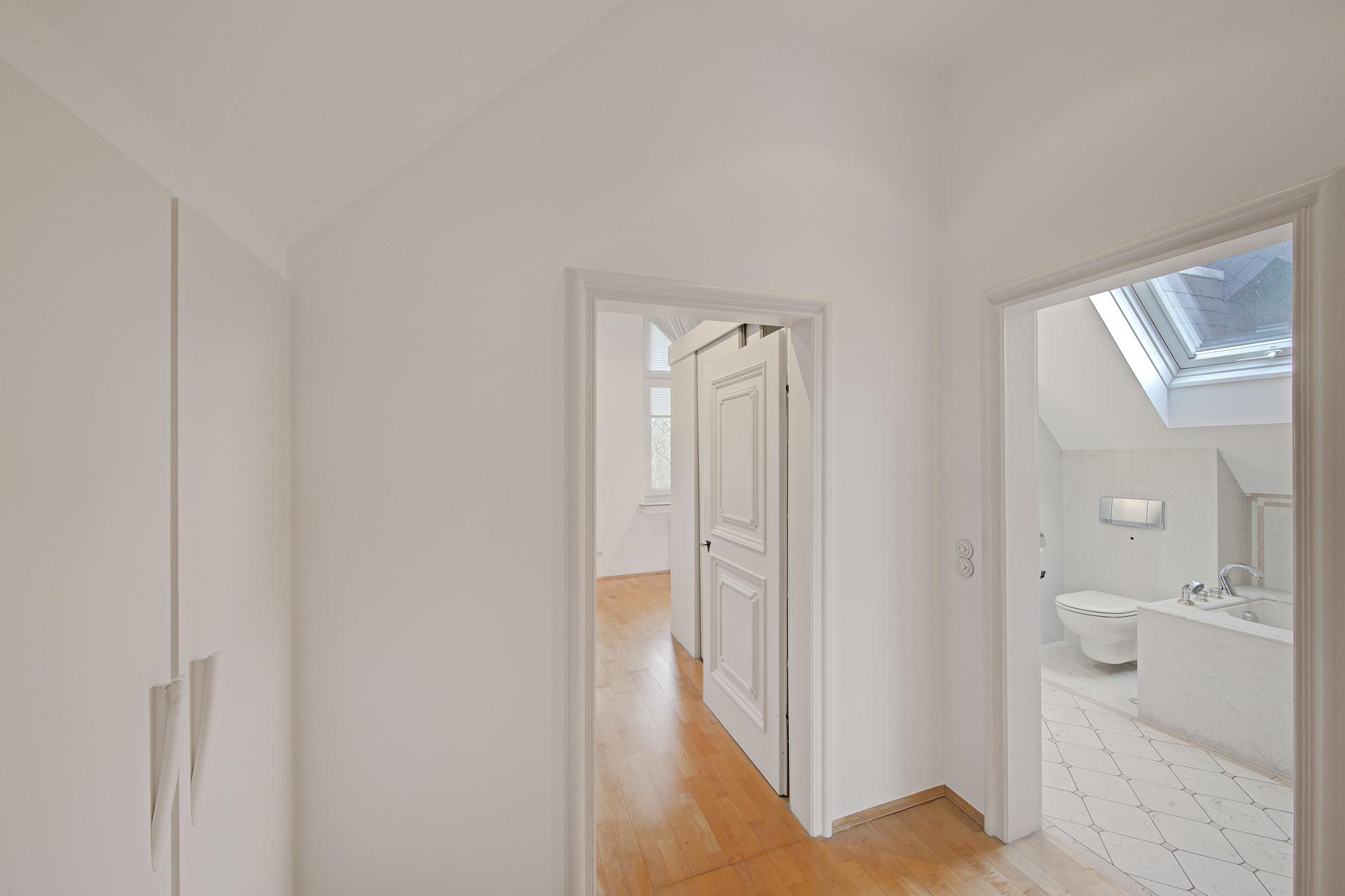 Das Gäste-WC ist zeitlos elegant mit Carrara-Marmor ausgestattet. In allen Wohn-, Schlaf- und Flurbereichen wurde hochwertiger Parkettboden verlegt. Maßgefertigte Einbauschränke sowie zahlreiche Schreinerarbeiten unterstreichen den gehobenen Anspruch. Besonders prägend sind die antiken Türen aus Eiche-Naturholz, weiß lackiert und mit hochwertigen Beschlägen versehen, die der Wohnung eine ruhige, elegante Note verleihen.