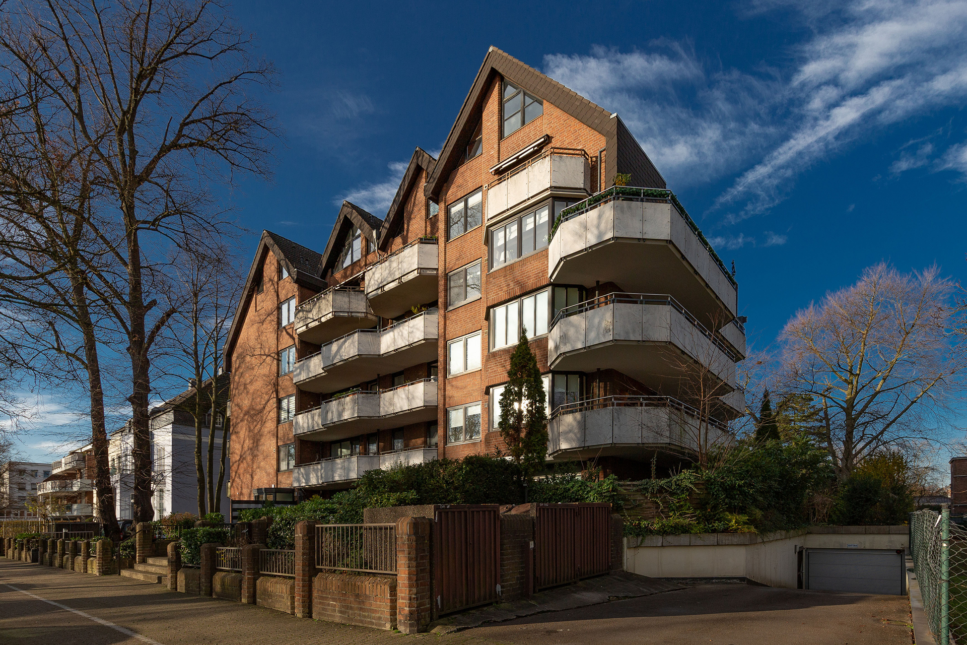 Das Mehrparteienhaus aus dem Baujahr 1980 ist Teil einer gepflegten Eigentümergemeinschaft mit insgesamt 33 Wohneinheiten sowie einer Büroeinheit im Erdgeschoss. Das fünfgeschossige, vollverklinkerte Gebäude verfügt über ein repräsentatives Treppenhaus mit Aufzug, der die Tiefgarage, den Kellerbereich und die Wohnetagen miteinander verbindet. Zur Wohnung gehören ein Kellerraum, gemeinschaftliche Nutzflächen sowie zwei Stellplätze in der Tiefgarage. Eine seitlich angelegte Zuwegung ermöglicht einen barrierearmen Zugang zum Gebäude sowie Aufzug.
