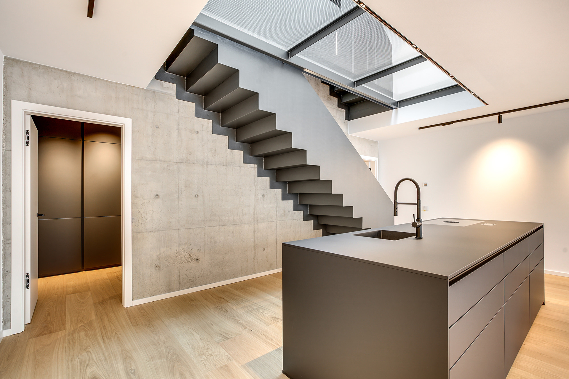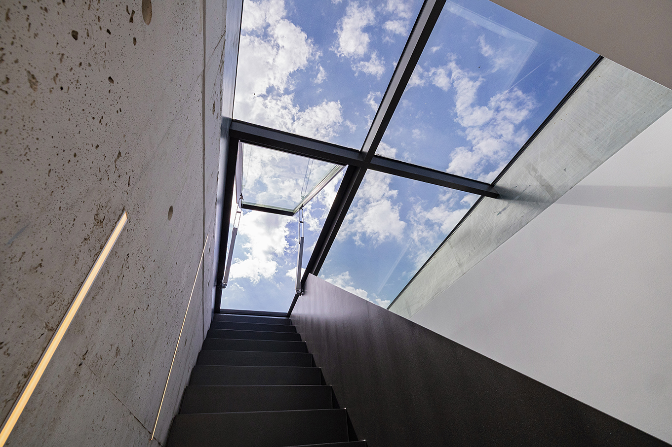 Die durchgängige Rohstahltreppe führt schließlich in die oberste Ebene. Mit einem Knopfdruck öffnet sich das großflächige Glasdach und gibt den Blick in den Himmel frei. Dieser spektakuläre Aufgang lässt Licht über die Glasbridge durch alle Etagen bis ins Erdgeschoss fallen und schafft eine unverwechselbare Wohnatmosphäre. Die Dachterrasse selbst ist teilweise begrünt, mit Glasbrüstung gefasst und bietet einen privaten Außenbereich für entspannte Stunden mit Weitblick über das Zooviertel.