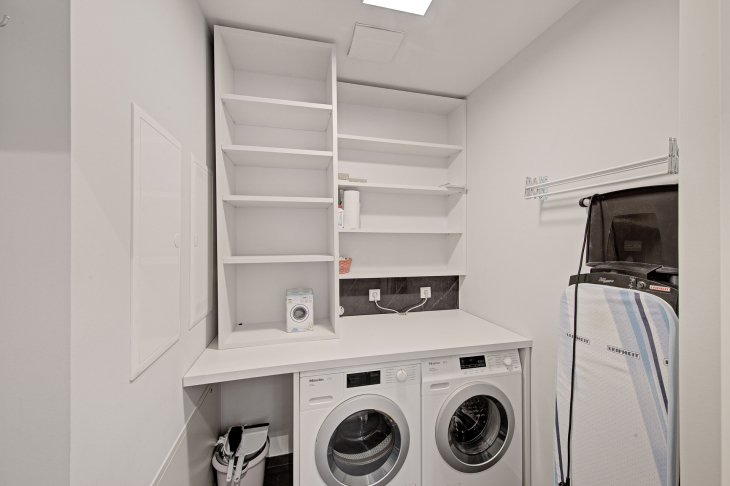 - Hauswirtschaftsraum innerhalb Ihrer Eigentumsetage mit massgefertigten Einbauten inklusive Waschmaschine und Trockner