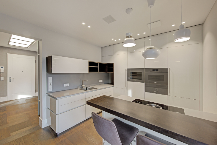 Ein repräsentativer, lichtdurchfluteter, offener Wohn-/Essbereich und separater luxuriöser Designer-Küche, welche über das großzügige Entrée mit maßgefertigter Garderobe verbunden sind. Der separierte Flur führt in die privaten Räume der Premium-Wohnung: ein exzellent gestalteter Masterbedroom mit maßgefertigten Schrank-Einbauten gefolgt von einem exklusivem, klassisch-modernem Masterbad mit angefertigten Utensilschrank und Regalborden. Ein ebenso exquisit ausgestattetes Arbeits- oder Gästezimmer ganz nach Bedarf, mit direktem Zugang auf den großzügigen, sonnigen Süd-Balkon. Zudem ein separates elegantes Gäste-WC und besonders vorteilhaft: der integrierte Hauswirtschaftsraum. Die Ausstattungsakzente der kompromisslos hochwertigen Einrichtung findet sich in allen Wohnbereichen wieder.