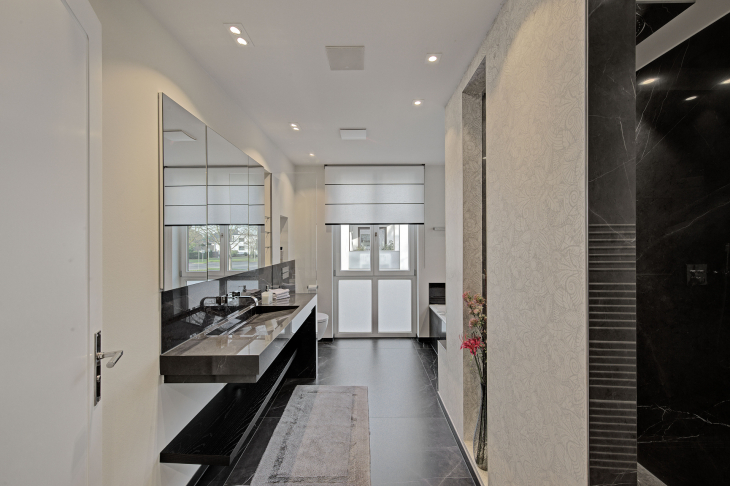 - Klassisch-modernes Masterbad mit massgefertigtem Waschtisch und Walk In-Dusche mit Rainshower (Decken-Einbaudusche)