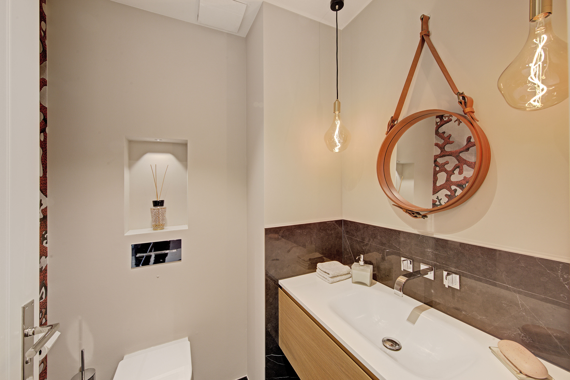 - Elegantes Gäste-WC mit angefertigtem Waschtisch, Dornbracht-Armatur, großformatigen Keramikelementen, Lichtkonzept und Design-Tapete