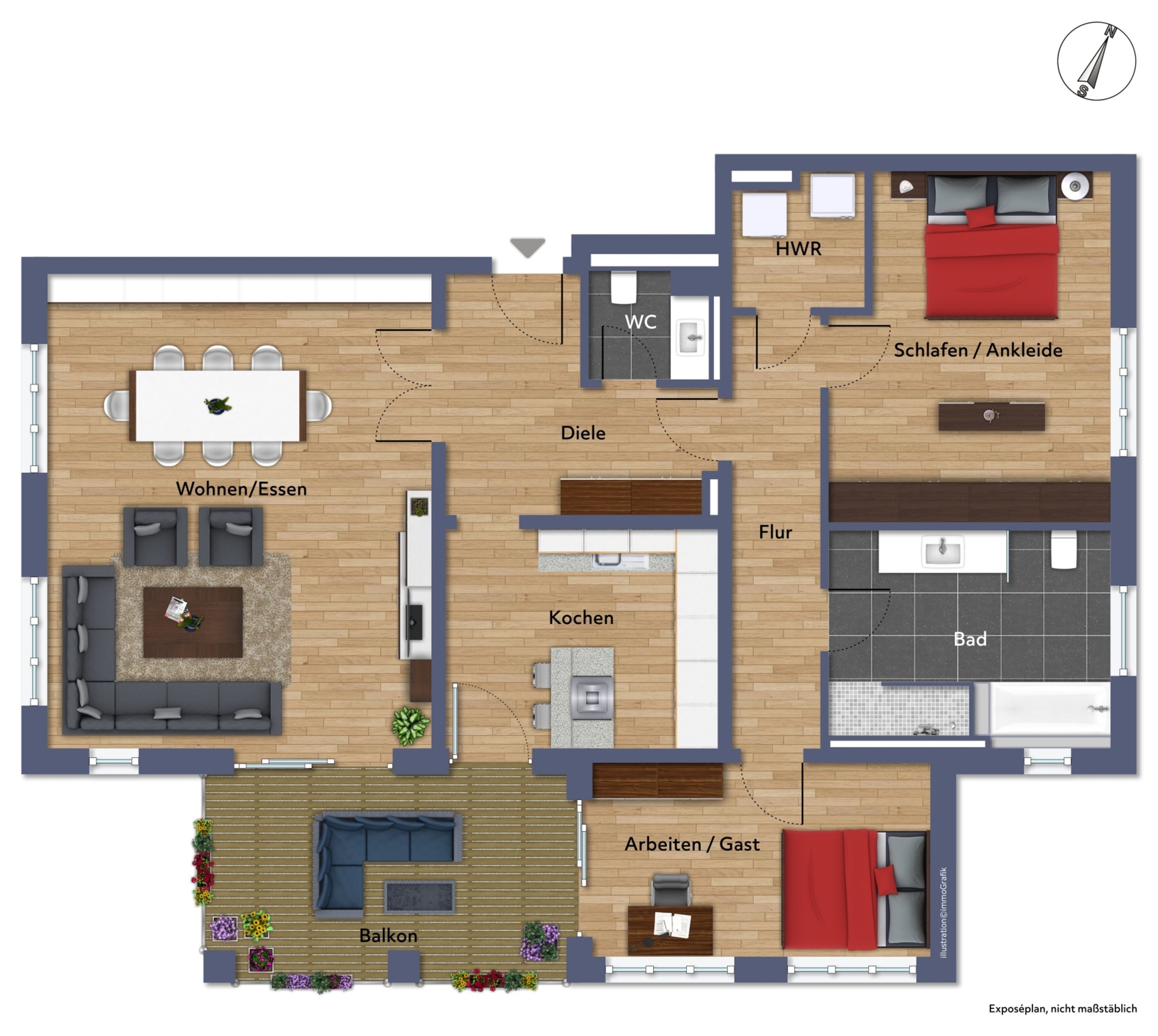 - Drei Zimmer mit einer Wohnfläche von ca. 122,4 m²
