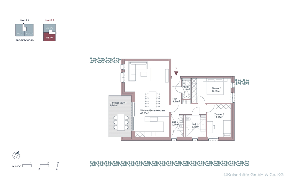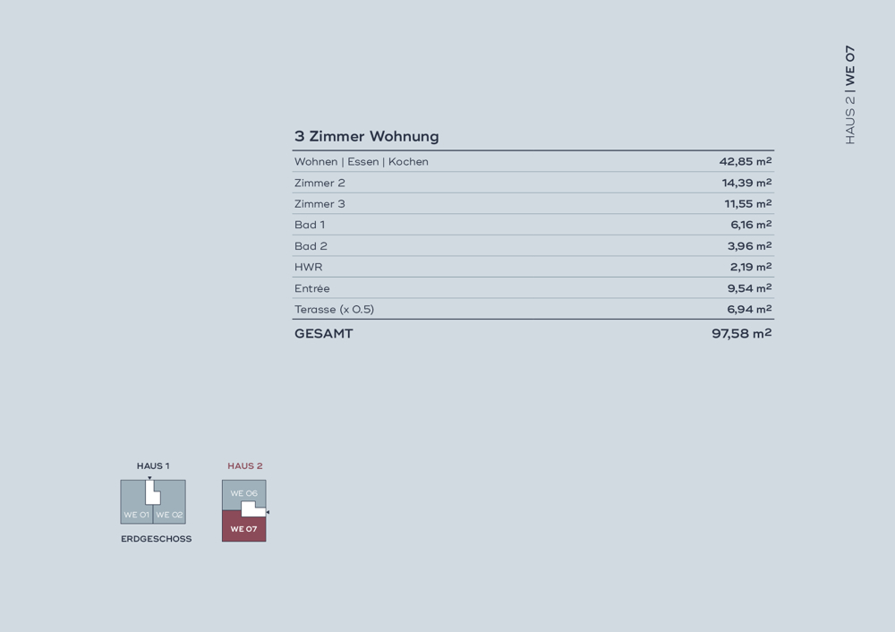 - Eine großzügige Terrasse/Loggia pro Eigentums-Halbetage, eine geräumige Dachterrasse für das Penthouse sowie zwei Terrassen für WE03+04 mögliche 5 Raumwohnung