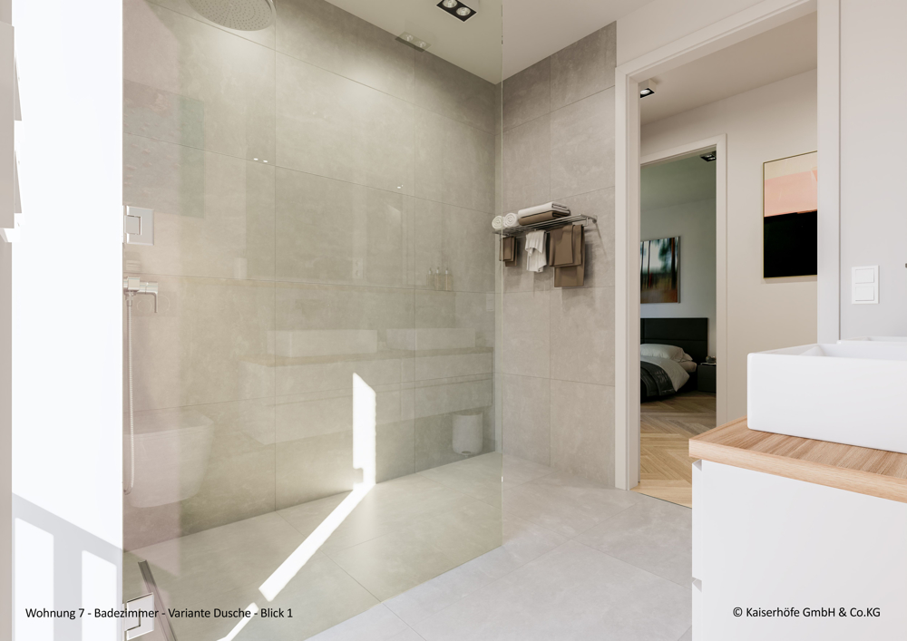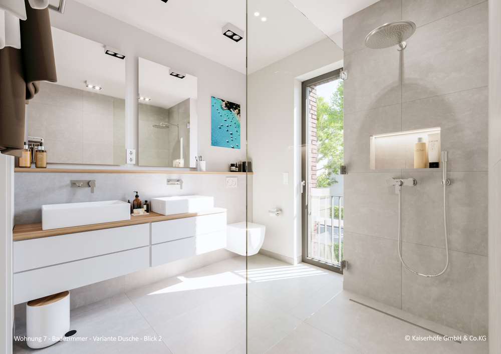 - Hochwertige Sanitärausstattung (Hersteller u. a. Duravit, Gessi, Glas Sprinz, Vigour und Geberit)