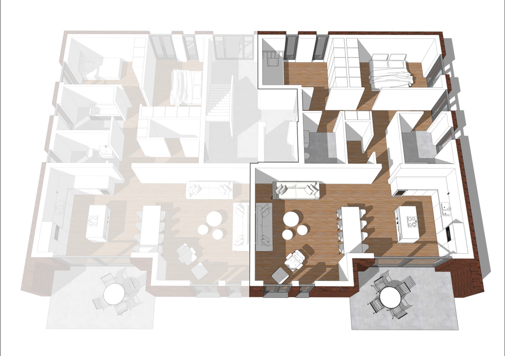 - Zwei separate Villenbaukörper mit fünf Parteien in Haus 1 und vier Parteien in Haus 2, unterirdisch durch eine Tiefgarage verbunden