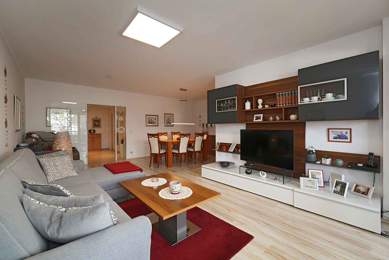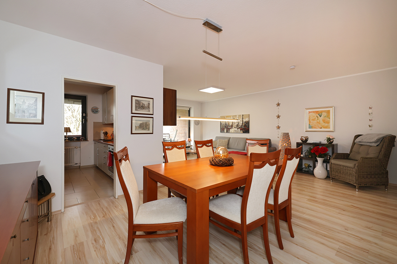 Herzstück der Wohnung ist der großzügige Wohn- und Essbereich (ca. 32m²), der durch seine offene Gestaltung ein besonders angenehmes Raumgefühl vermittelt. Die große Fensterfläche sorgt für viel Tageslicht und bietet direkten Zugang zur überdachten Loggia mit einem schönen Blick ins Grüne. Hier lässt sich der Feierabend in ruhiger Atmosphäre genießen.