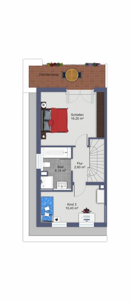 Über die offene Treppengestaltung gelangt man in das Obergeschoss; als Staffelgeschoss konzipiert gibt es hier keine störenden Schrägen. Neben einem geräumigen Hauptschlafzimmer, einem weiteren kleineren Schlafzimmer, wurde besonderer Wert auf das hochwertige Tageslichtbadezimmer mit Badewanne und bodentiefer Dusche gelegt. Das Hauptschlafzimmer ist ruhig zur Gartenseite gelegen und verfügt über einen eigenen Balkon. Zwei geräumige Kinderzimmer mit Gartenausrichtung und somit ebenfalls sehr ruhig, befinden sich im Souterrain des Hauses. Mit über 6m² kann sich auch in dieser Etage das Duschbadezimmer eigens für die Kinder sehen lassen!