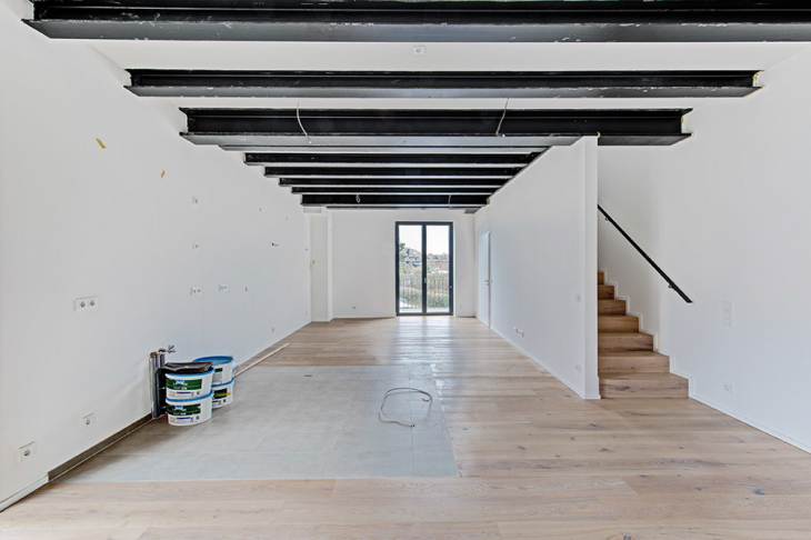 Fußbodenheizung , helles Parkett, sichtbare Stahlkonstruktionen und eine offene Architektur beschreiben den hohen architektonischen Anspruch.