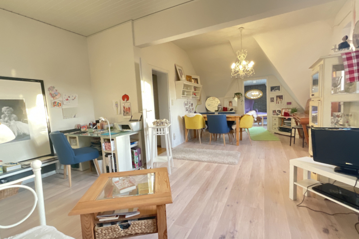 Über ein abgeschlossenes Treppenhaus mit der originalen Holztreppe erreichen Sie die gepflegte Wohnung. Alle Räume sind über die zentrale Diele zu erreichen. Linkerhand geht es in den Wohnbereich, der ausreichend Platz für eine Sitzecke und einen Esstisch bietet. Anliegend gibt es noch ein kuscheliges Nebenzimmer für entspannte Lesestunden oder Platz für den Homeoffice-Schreibtisch. Durch die nach historischem Vorbild erstellten Holz-Sprossenfenster erhalten Sie viel Licht und einen sehr schönen Ausblick auf den geschichtsträchtigen Hülser Marktplatz mit der Pfarrkirche St. Cyriakus. Der Holzfußboden und die Dachschrägen tragen zu der gemütlichen und stimmungsvollen Atmosphäre der Wohnung bei.