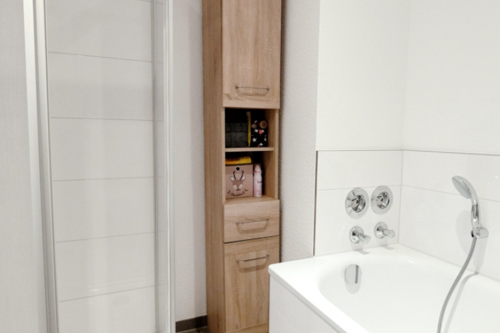 - modernes, weiß gefliestes Bad mit Dusche und Badewanne