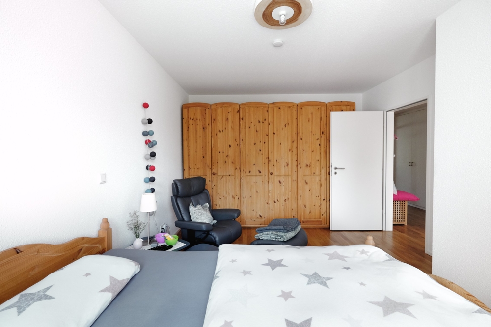 Beim Betreten der Wohnung gelangen Sie in eine wohnliche, zentrale Diele. Hier, ebenso wie in den drei Wohnräumen, wurde hochwertiges Echtholzparkett verlegt. Dank angenehmer Fußbodenheizung gibt es keine störenden Heizkörper, welche Stellplatz an den Wänden rauben könnten oder den Blick durch bodentiefe Fenster stören. Die große Fensterfläche und eine offene Küchengestaltung verleihen dem Wohn-Essraum ein angenehmes und großzügiges Wohnambiente mit direktem Zugang auf den schönen, ca. 11m² großen Balkon. Zusätzlich zum geschmackvoll ausgestatteten Badezimmer mit Badewanne und Dusche, verfügt die Wohnung über ein weiteres Gäst-WC. Die Großzügigkeit des Hauptschlafzimmer bietet ausreichend Platz für ein großes Schrankelement und ein Doppelbett. Ein weiteres Schlafzimmer kann wahlweise als kleines Kinderzimmer, Arbeitszimmer, begehbares Kleider- oder Gästezimmer genutzt werden.