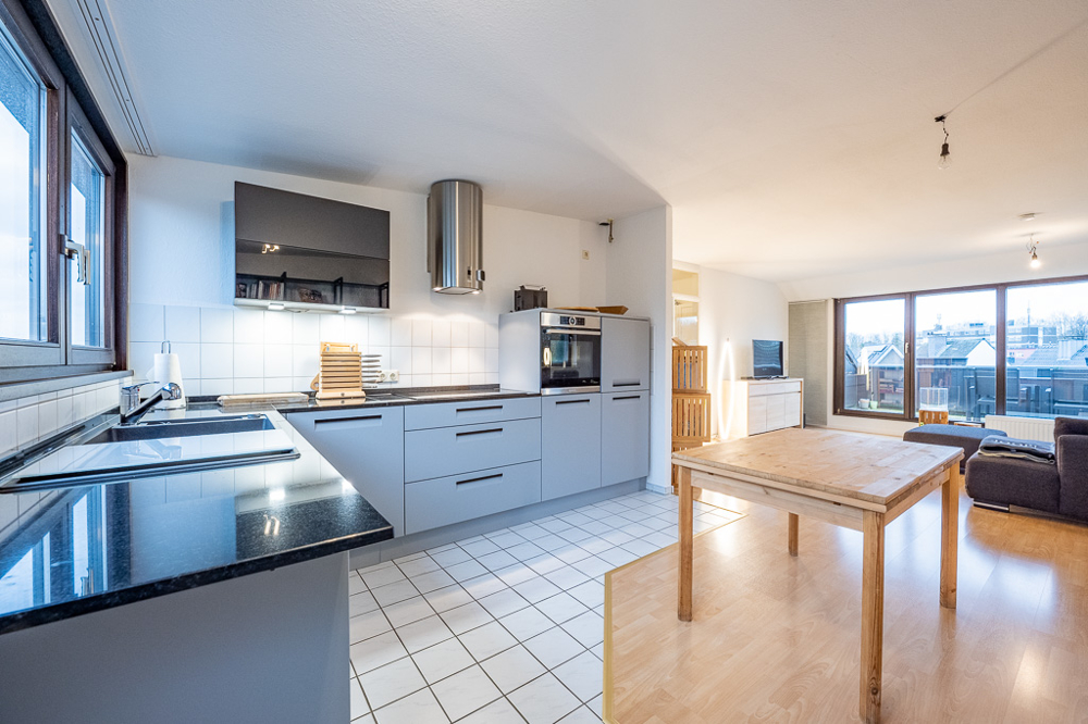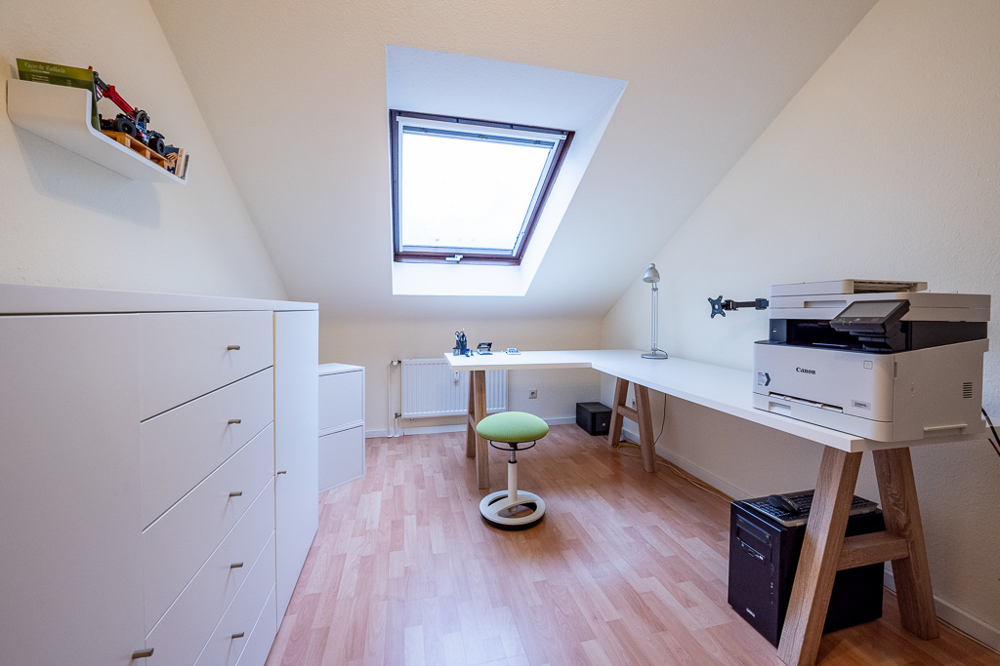 Die lichtdurchflutete Wohnung betreten Sie über einen zentralen Dielenbereich, der die übrigen Räume durch eine Glastüre zur offenen ca. 39 m² großen Wohnküche trennt. Neben einem hell gefliesten Tageslichtbadezimmer mit Wanne und Dusche, verfügt die Wohnung über ein komfortables Kinder- oder Arbeitszimmer sowie ein großzügiges Schlafzimmer mit ausreichend Stellfläche für den Kleiderschrank. Beide Schlafräume sind mit Velux Dachflächenfenstern ausgestattet, die sich von innen beschatten lassen.
