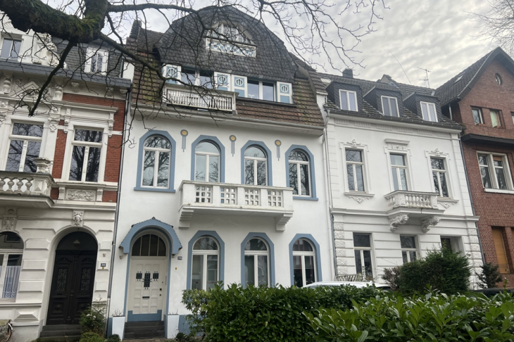 Das herrschaftliche Stadthaus entstand um 1900 in klassischer Jugendstil-Architektur und steht heute unter Denkmalschutz. Höchst anspruchsvoll und detailverliebt haben die damaligen Bauherren z. B. den Eingangsbereich, das Treppenhaus und die Straßenfassade gestaltet.