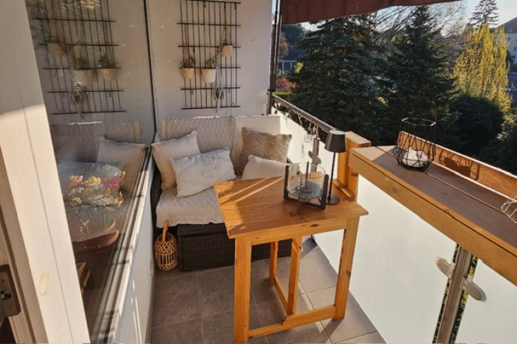 Ein schöner Wohnbereich mit einem kleinen zauberhaften Balkon. Ein geräumiger Küchenbereich mit wunderschönem Ausblick in die grünen Baumkronen.