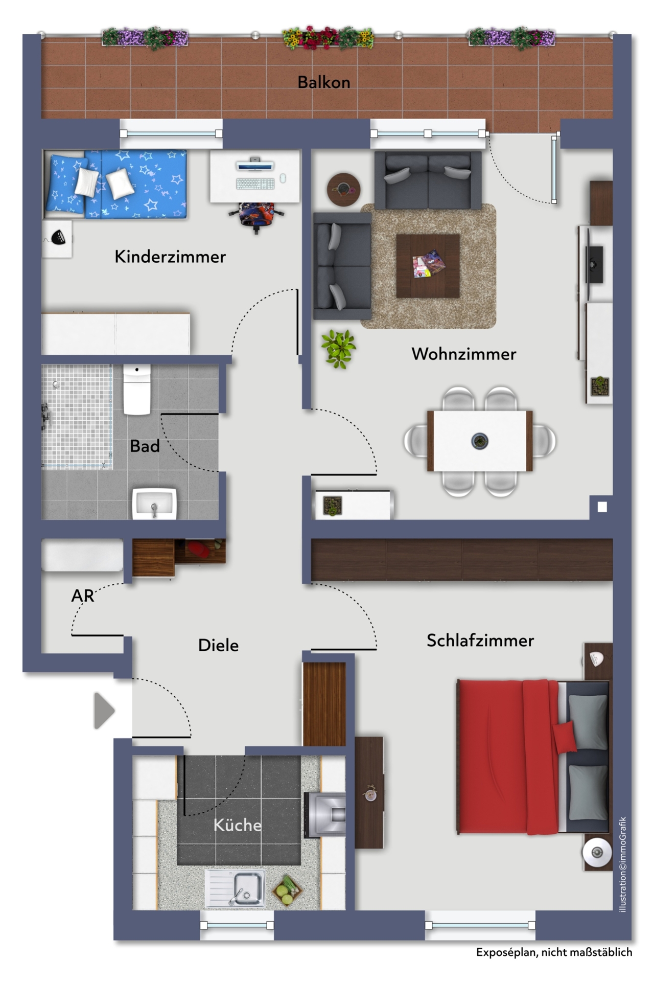 Das Herzstück der Wohnung bildet das helle Wohnzimmer mit direktem Zugang zum großen West-Balkon. Hier eröffnet sich ein angenehmer Rückzugsort, der zum Entspannen und Verweilen im Freien einlädt. Große Fenster sorgen für eine freundliche, lichtdurchflutete Atmosphäre und unterstreichen den gemütlichen Charakter der Wohnung.